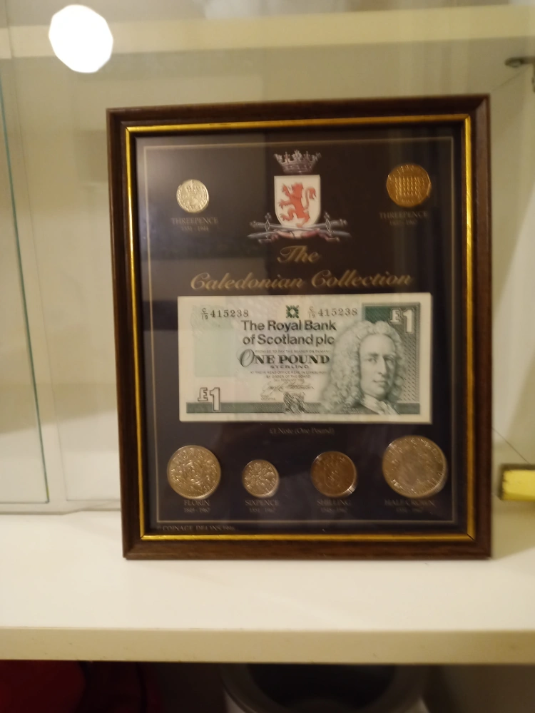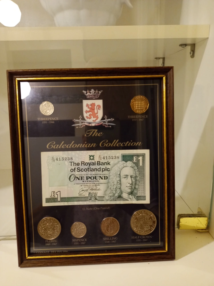 Selling a framed collection called "The Caledonian Collection". It includes a Royal Bank of Scotland one pound banknote and various coins, including a threepence, florin, sixpence, shilling, and half crown. It's a nice piece for collectors!