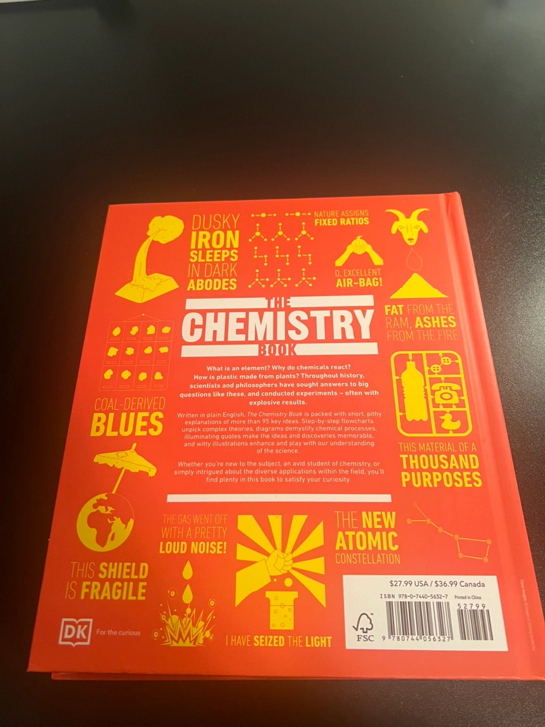 Hardcover book exploring chemistry concepts. Features colourful illustrations and diagrams. Explains complex chemical processes simply. Suitable for students or anyone interested in chemistry. It helped me a lot for Chemistry. Cash only.