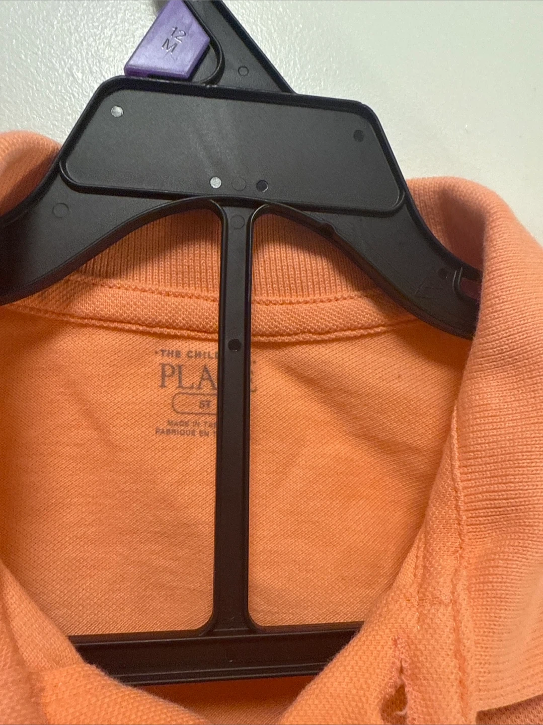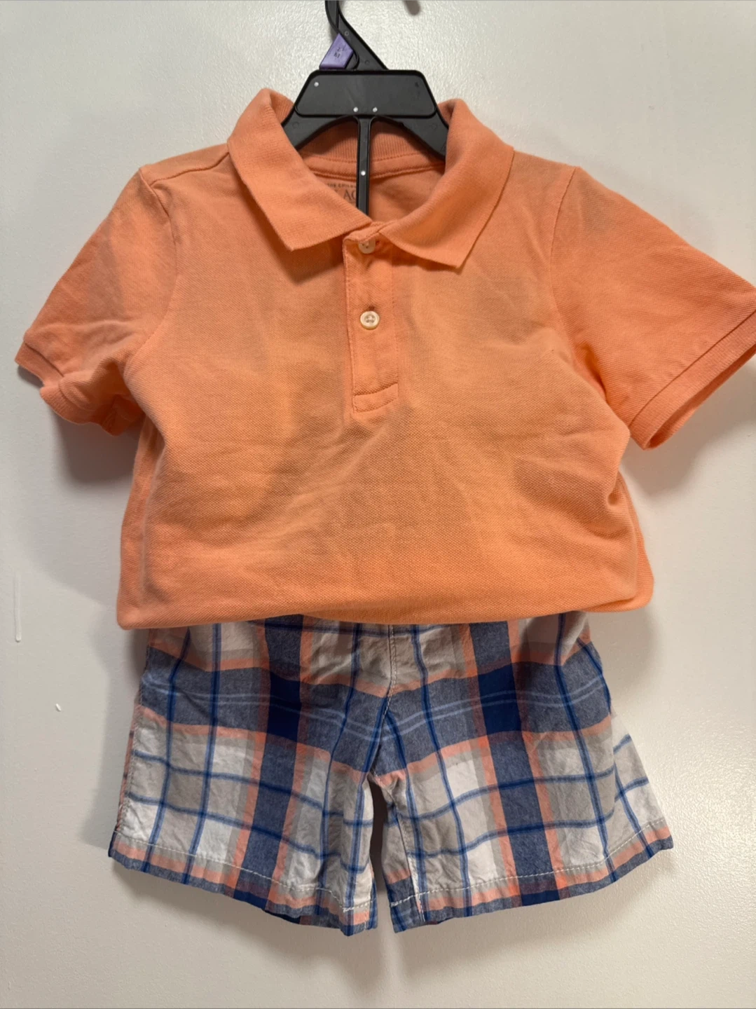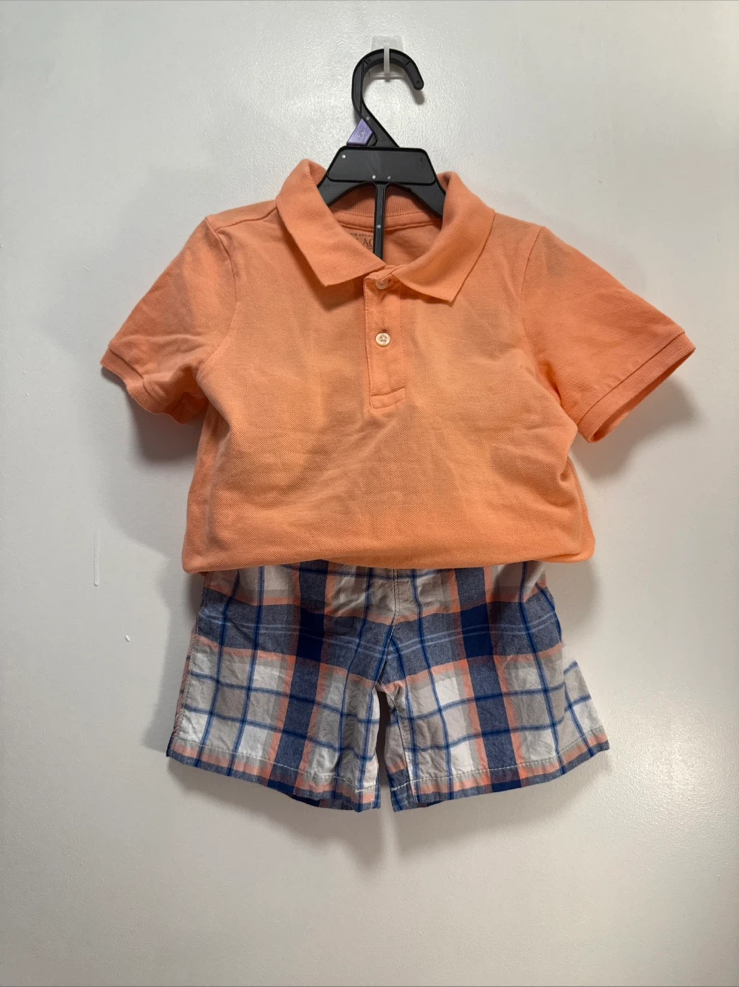 A cute outfit from The Children's Place in size 5T! The top is a solid peach-orange polo shirt, and the shorts are a blue, white, and peach plaid. Perfect for your little one!