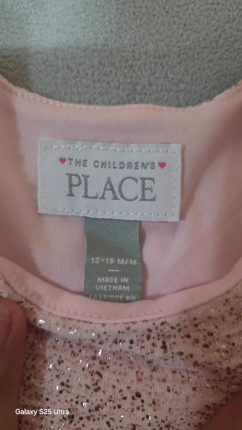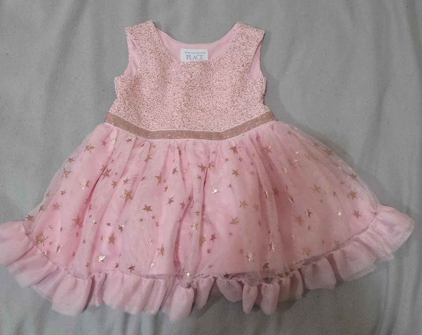 15A cute pink dress from The Children's Place! It's in great condition and perfect for a little one aged 12-18 months. The dress features a sparkly bodice and a tulle skirt with gold star accents. It's made in Vietnam.