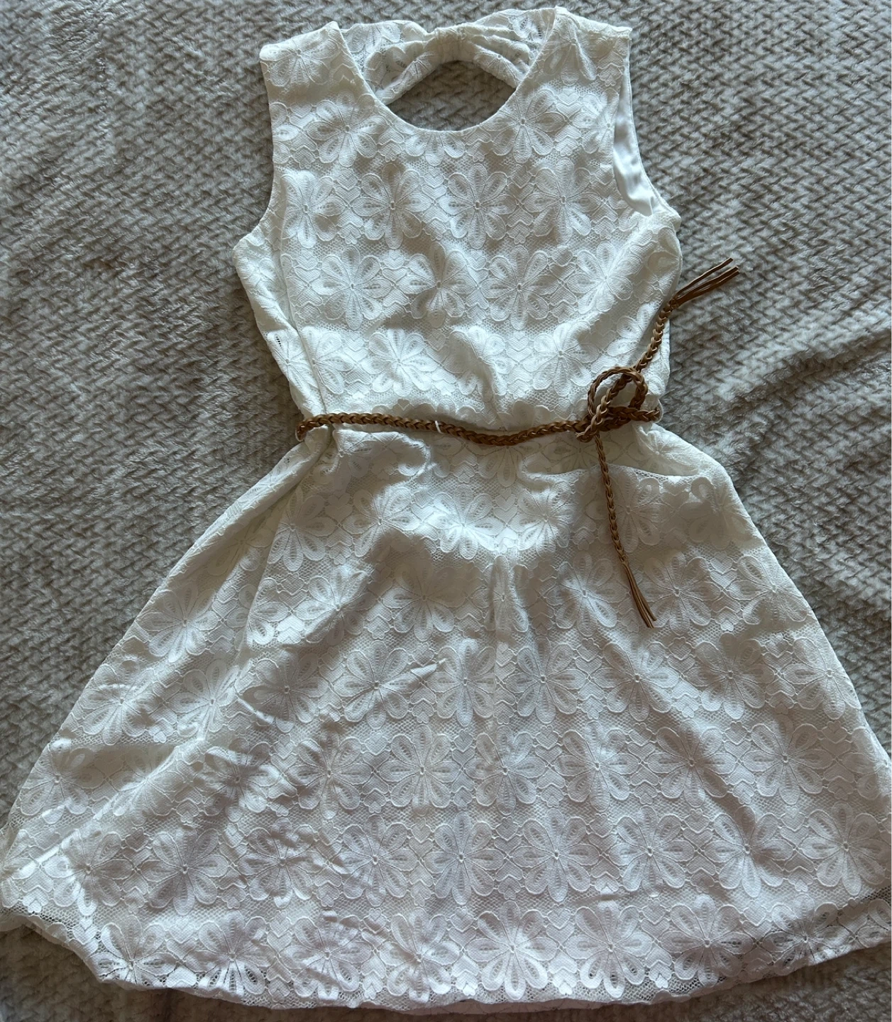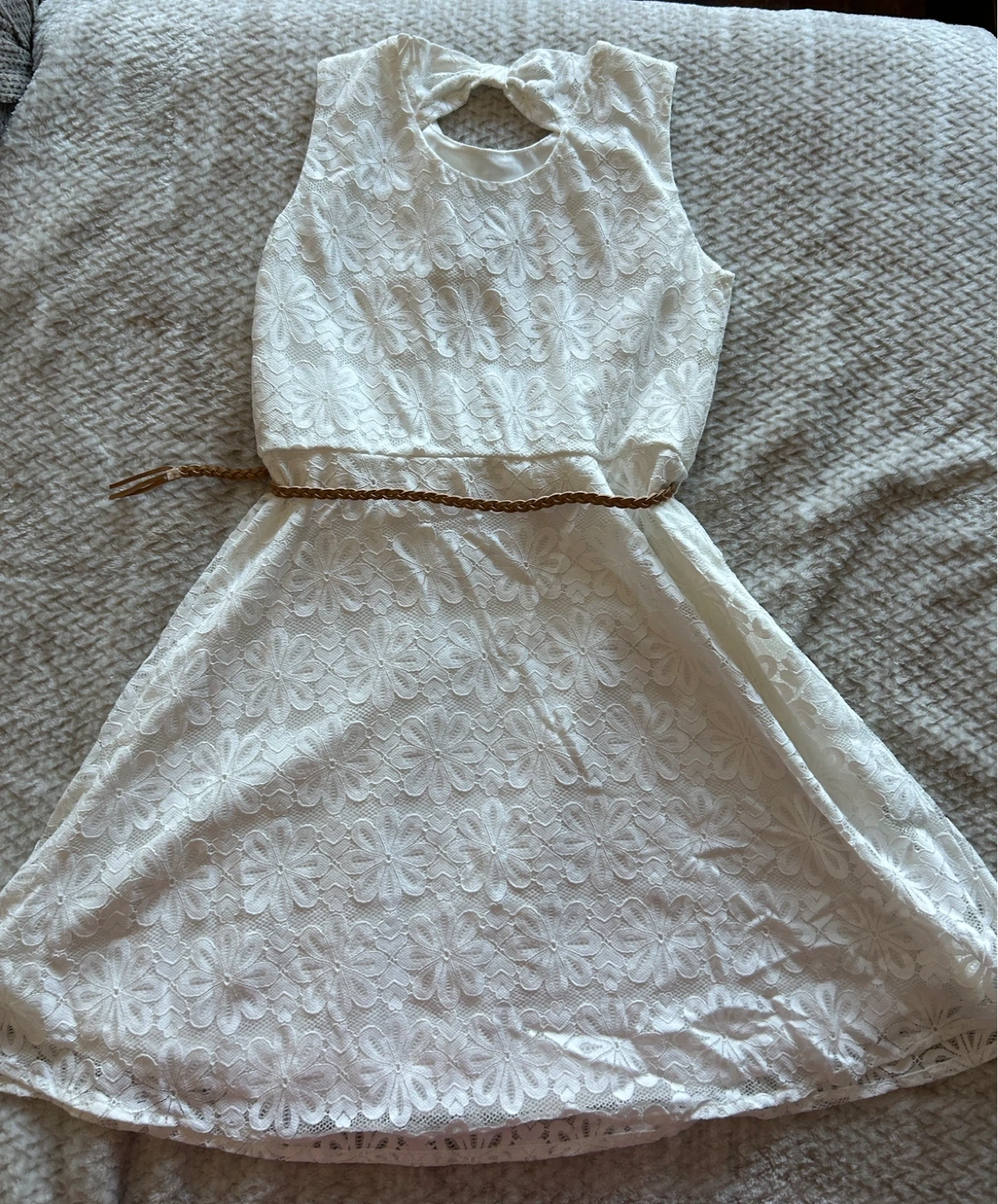 A lovely white lace dress! It comes with a cute brown belt to cinch the waist. Perfect for a summer day or a special occasion Size 10/12 (Large)