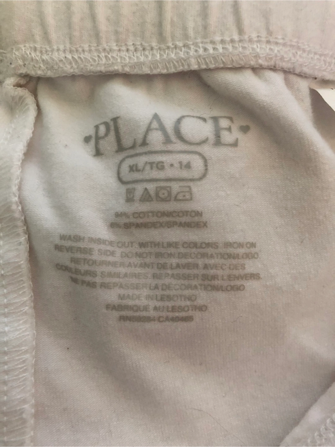 Selling a pair of white leggings from The Children's Place. They're a size XL, which is equivalent to a size 14. The material is 94% cotton and 6% spandex, making them nice and comfy to wear!