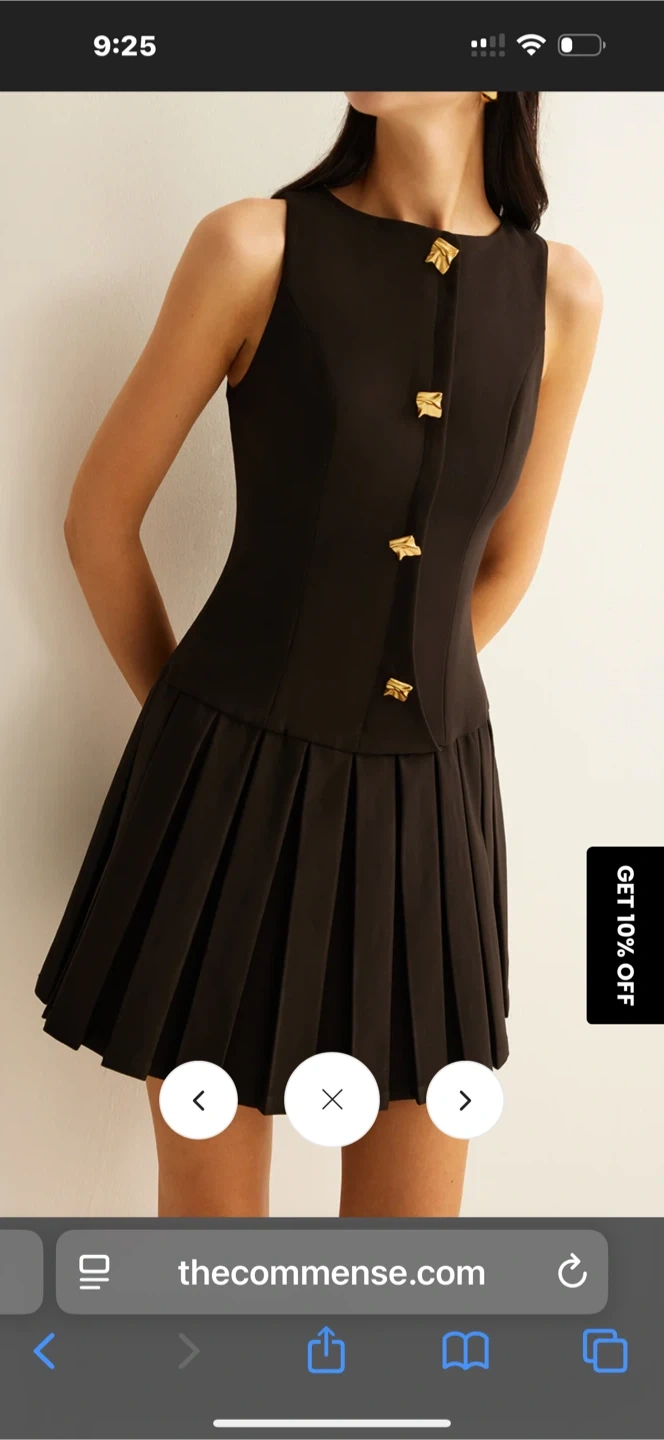 16Selling a stylish black mini dress from The Commense. It features a sleeveless design with a pleated skirt and unique gold-tone button details down the front. Perfect for a chic and sophisticated look! Composition: 92% Polyester, 8% Elastane Thickness: Regular Material: Woven Fabric Sleeve Length: Sleeveless Neckline: Crew Neck Dresses Length: Short Stretch: Slight Stretch Fit Type: Regular Fit