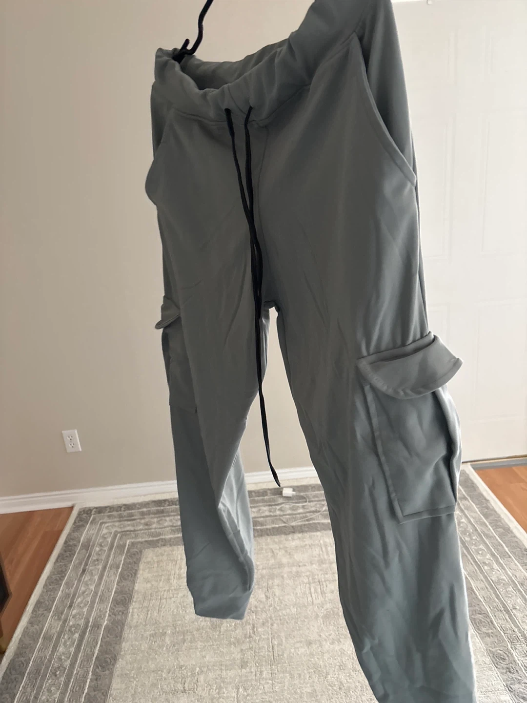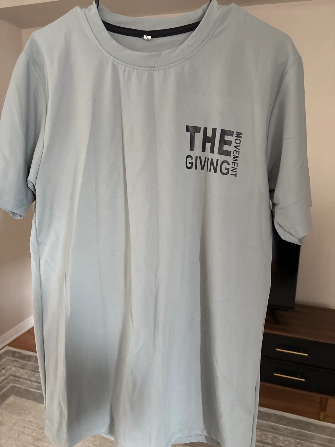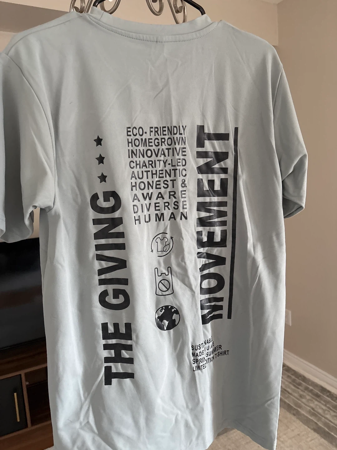 Selling a matching set from The Giving Movement! This set includes a t-shirt and cargo pants, both in a light blue-ish grey colour. The t-shirt has "THE GIVING MOVEMENT" printed on the front and back. The pants have a drawstring and pockets on the sides. Great for casual wear or workouts!