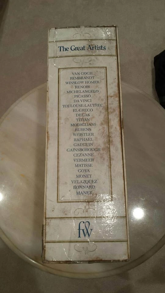 Own the complete 25-volume set of The Great Artists: A Library of Their Lives, Times and Paintings published by Funk & Wagnalls, Inc. Each volume is dedicated to a single legendary artist, with detailed biographies, historical context, and full-color reproductions of their most famous works. ✨ Artists included: Van Gogh, Rembrandt, Winslow Homer, Renoir, Michelangelo, Picasso, Da Vinci, Toulouse-Lautrec, El Greco, Degas, Titian, Modigliani, Rubens, Whistler, Raphael, Gauguin, Gainsborough, Cezanne, Vermeer, Matisse, Goya, Monet, Velázquez, Bonnard, Manet. 📖 Format: Softcover booklets in original slipcase 📅 Published: 1970s 📍 Condition: Books are in good vintage condition with clean pages. Slipcase shows some wear and aging (see photos). 💡 Perfect for: • Art history lovers • Collectors of vintage book series • Students and educators of fine arts • Unique coffee table conversation set