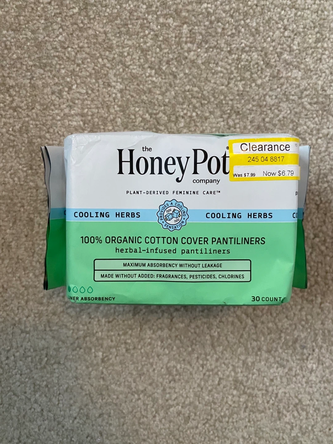 10The Honey Pot Company pantiliners. These are 100% organic cotton pantiliners, herbal-infused, and made without fragrances, pesticides, or chlorine. The pack has been opened and one has been removed, leaving it as a pack of 29. It is a resealable top. Pickup near Apto/Phelpston/Anten Mills. Delivery available at a minimal extra cost.