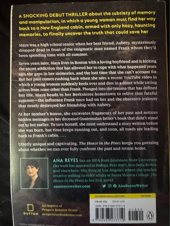 31The House in the Pines by Ana Reyes (2023): Armed with only hazy memories, a woman who long ago witnessed her best friend's sudden, mysterious death, and has since spent her life trying to forget, sets out to track down answers. What she uncovers, deep in the woods, is hardly to be believed. Seven years ago, Maya was a high school senior when her best friend, Aubrey, mysteriously dropped dead in front of the enigmatic man named Frank, whom they'd been spending time with all summer. Now, Maya lives in Boston with a loving boyfriend and is coping with the gaps in her memories and the lost time she can't account for. But her past comes rushing back when she comes across a recent YouTube video in which a young woman suddenly keels over and dies in a diner—sitting across from none other than Frank. Plunged into the trauma that has defined her life, Maya heads to her Berkshires hometown to finally confront that fateful summer and the sinister influence Frank once had on her. To save herself, she must understand a story written before she was born, but time keeps running out, and soon, all roads are leading back to Frank's cabin.