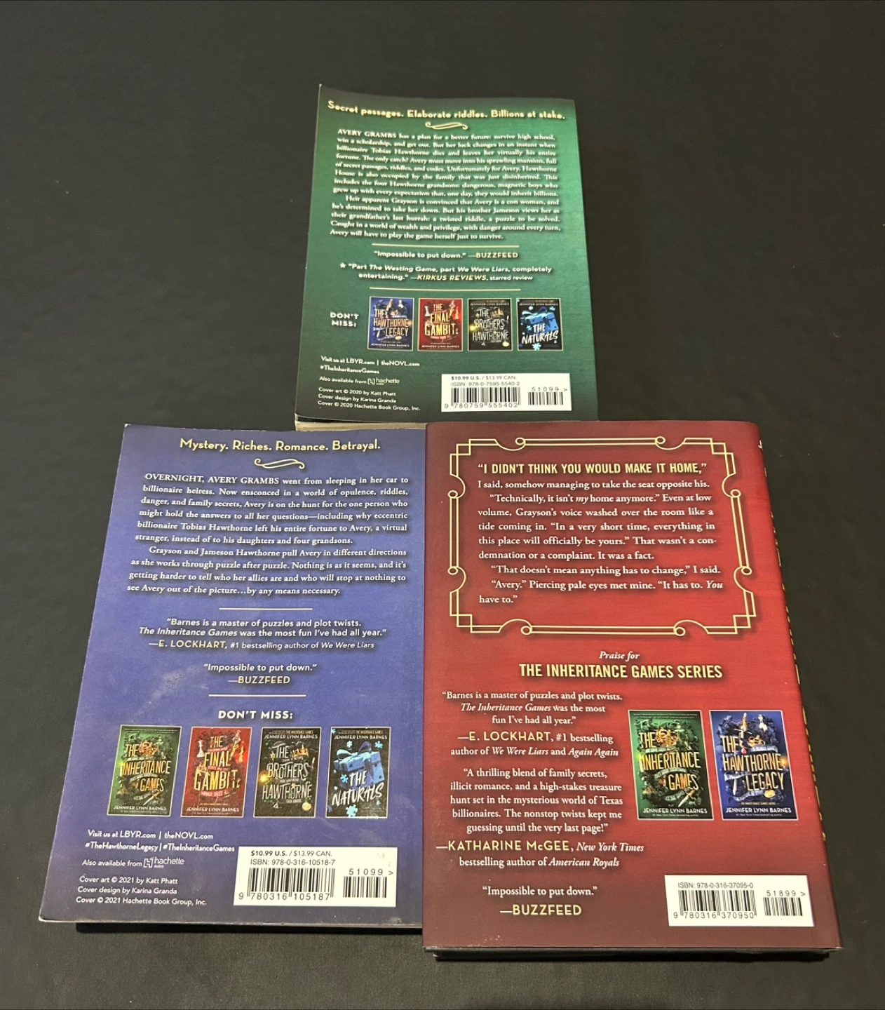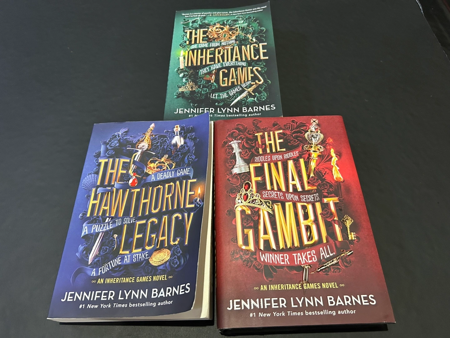Selling the complete Inheritance Games series by Jennifer Lynn Barnes! Includes: - The Inheritance Games - The Hawthorne Legacy - The Final Gambit Perfect for fans of mystery and puzzles Excellent used condition from SFPF home. Can arrange porch pick up or delivery depending on area.