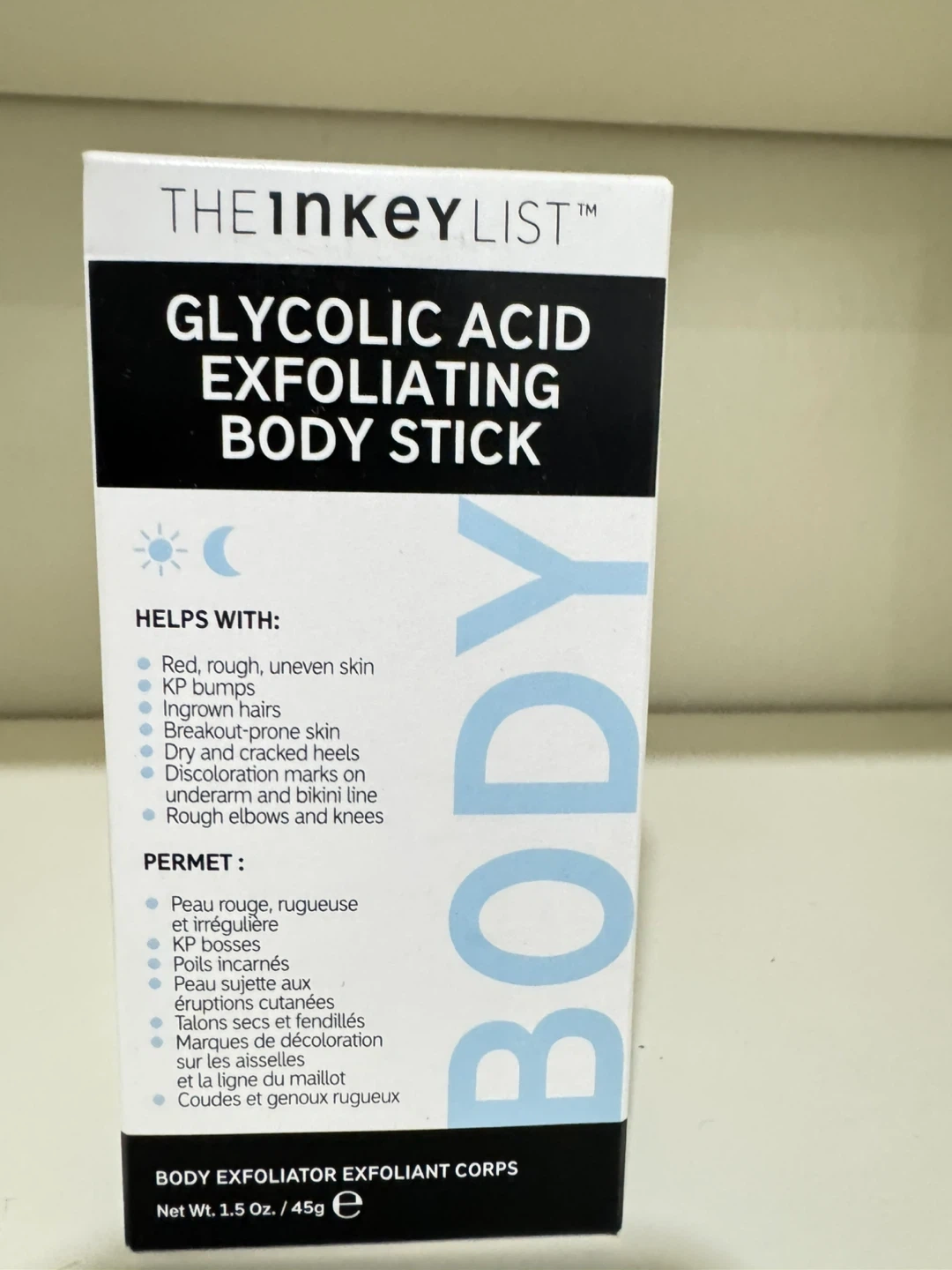 Selling The Inkey List Glycolic Acid Exfoliating Body Stick. It helps with red, rough, uneven skin, KP bumps, ingrown hairs, breakout-prone skin, dry and cracked heels, and discoloration marks. It is a body exfoliator with a net weight of 1.5 oz / 45g