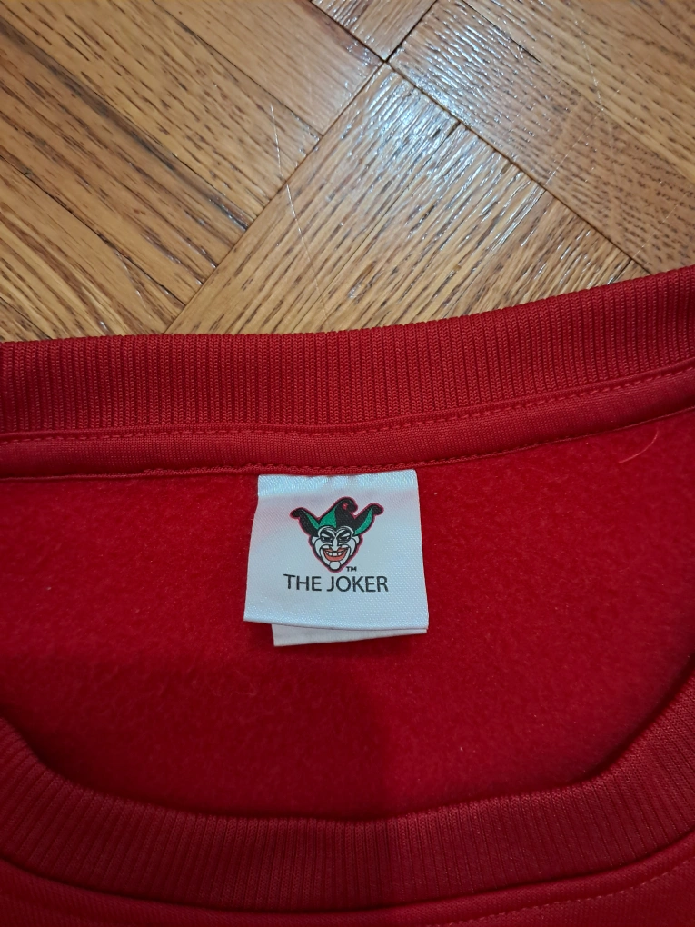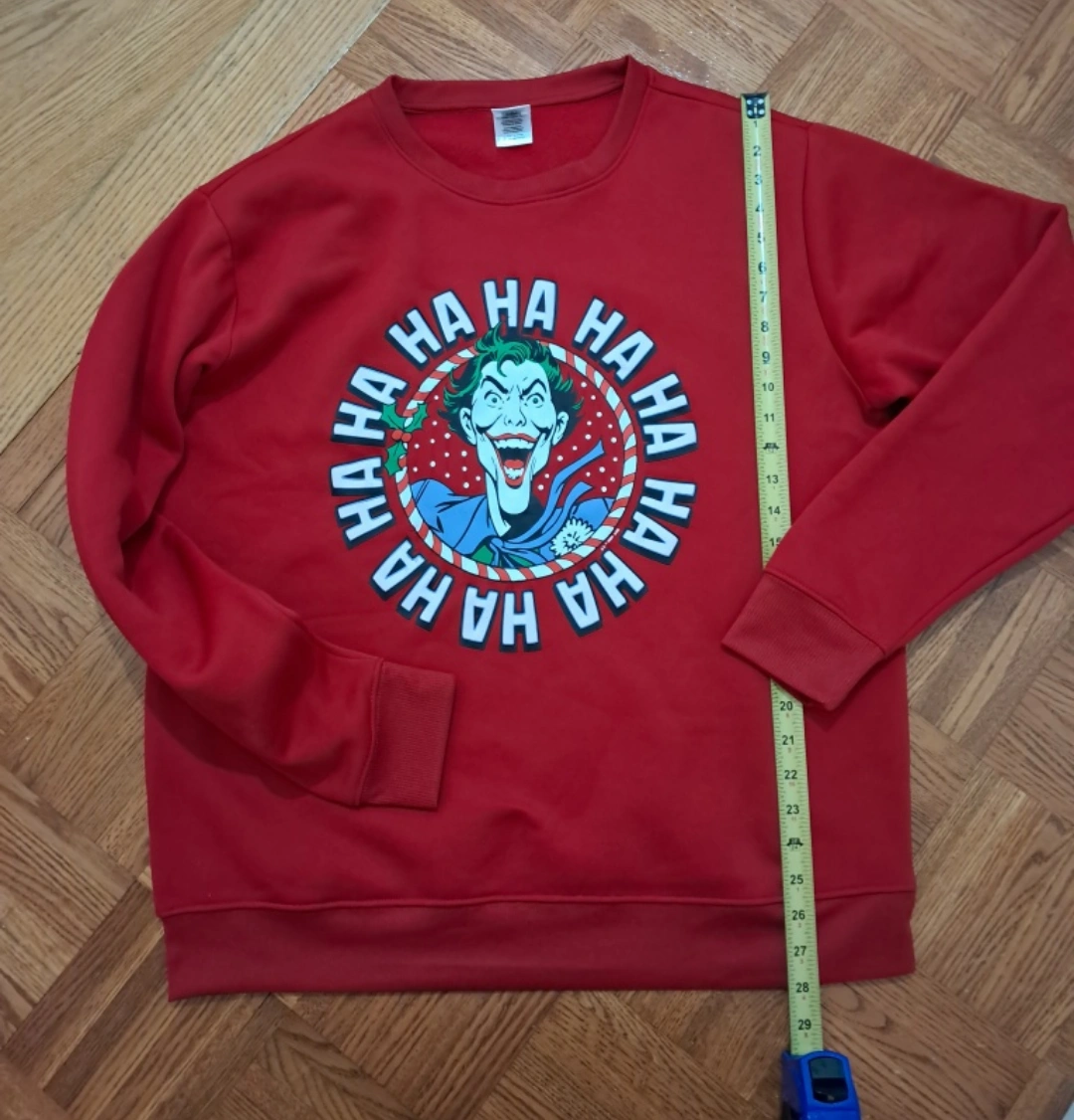 216Red long-sleeved sweater with a graphic of The Joker laughing. Has a festive Christmas theme.