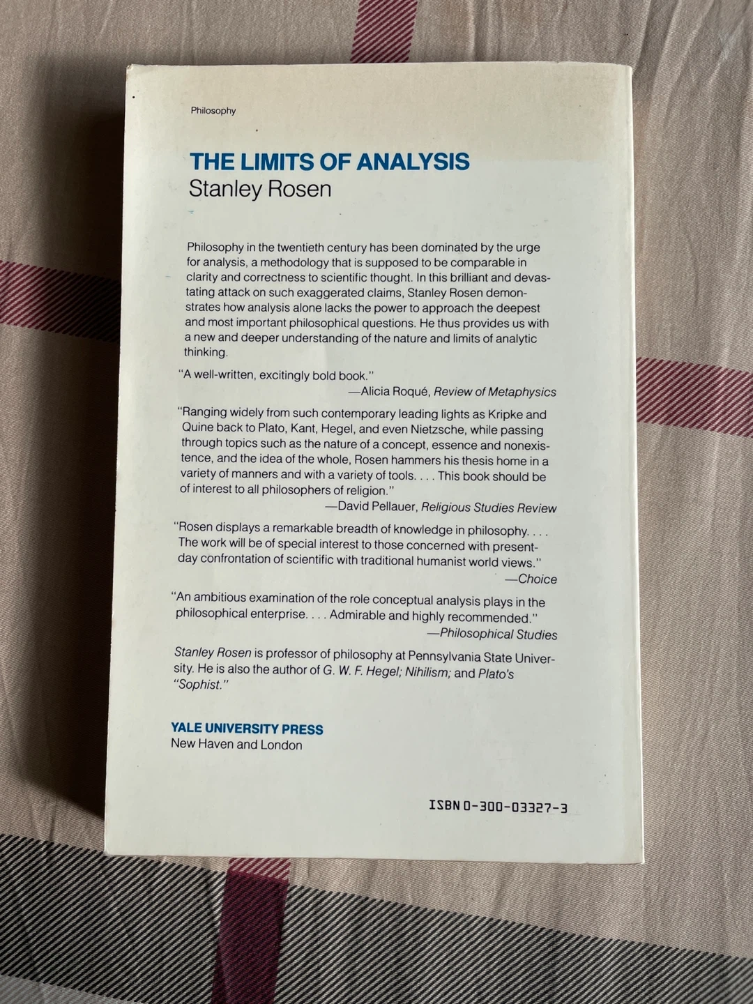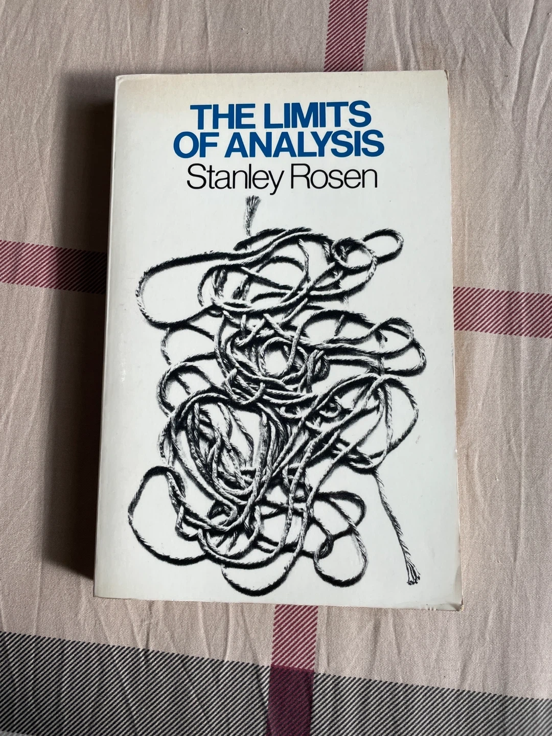 Cash payment only please. Selling "The Limits of Analysis" by Stanley Rosen, a philosophy book published by Yale University Press. This book delves into the depths of analysis and its role in contemporary thought. A great read for anyone interested in philosophy!