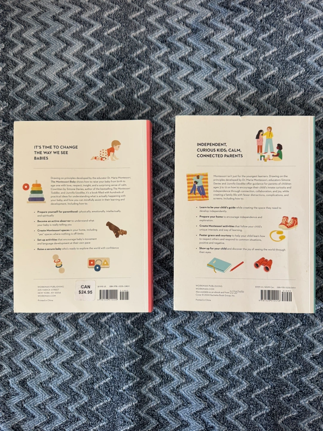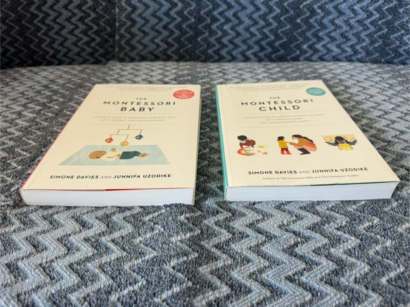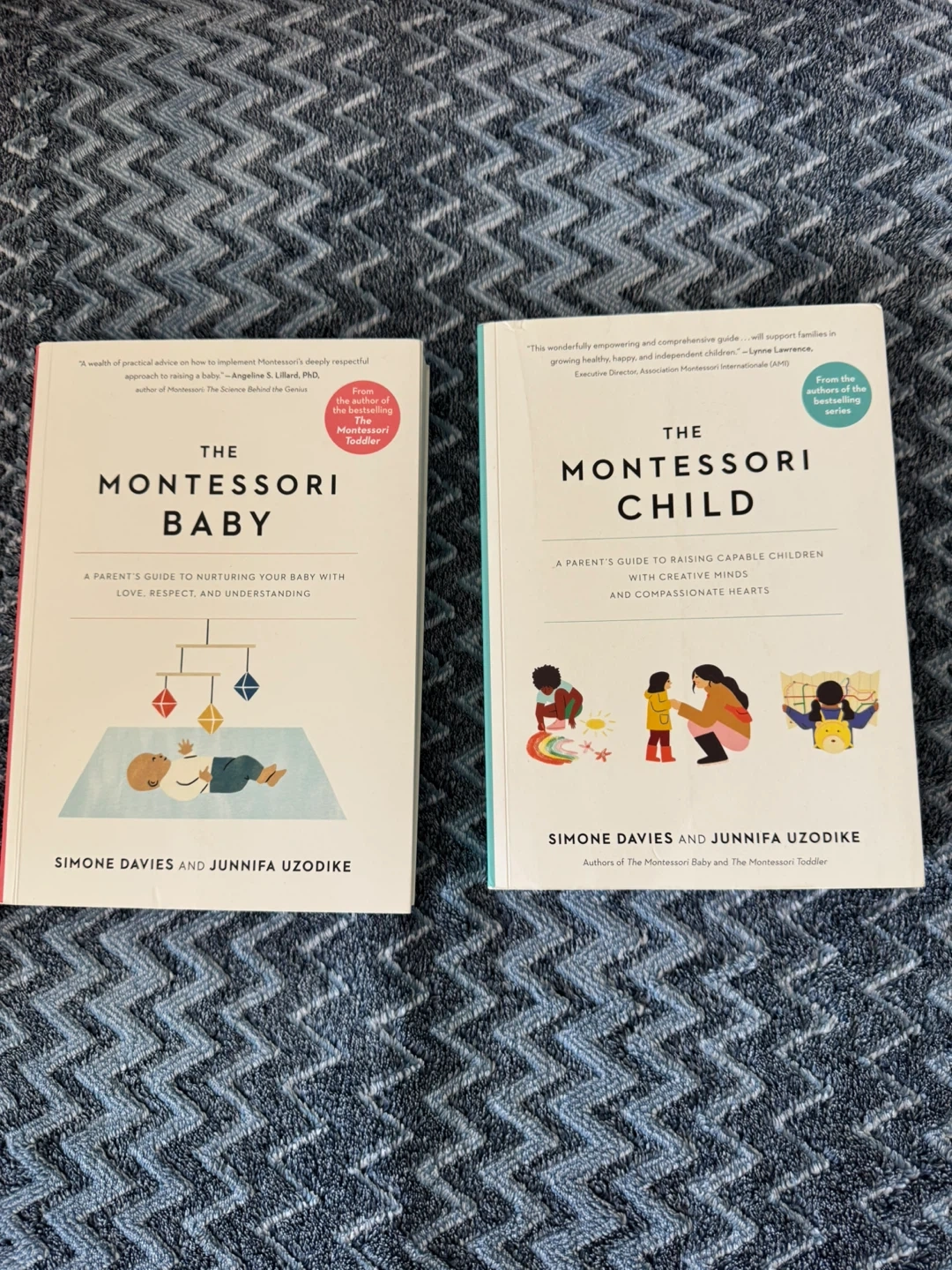 Selling two books by Simone Davies: The Montessori Baby and The Montessori Child. These books are a parent's guide to nurturing your baby with love, respect, and understanding and to raising capable children with creative minds and compassionate hearts. Original price $24.95 each