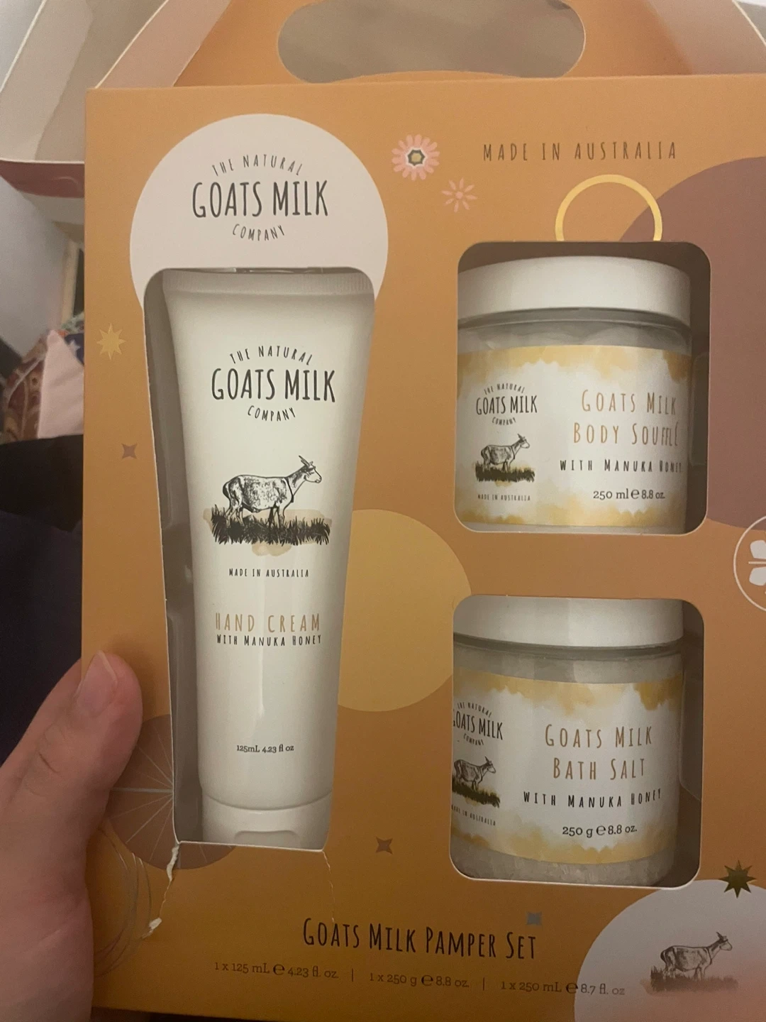 Treat yourself or someone special with this lovely Goats Milk Pamper Set from The Natural Goats Milk Company! The set includes: - Hand Cream with Manuka Honey (125mL) - Goats Milk Body Souffle with Manuka Honey (250mL) - Goats Milk Bath Salt with Manuka Honey (250g) Made in Australia