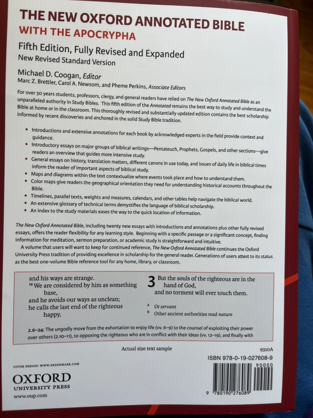 Selling The New Oxford Annotated Bible with the Apocrypha, Fifth Edition, Fully Revised and Expanded, New Revised Standard Version. This is an ecumenical study Bible.