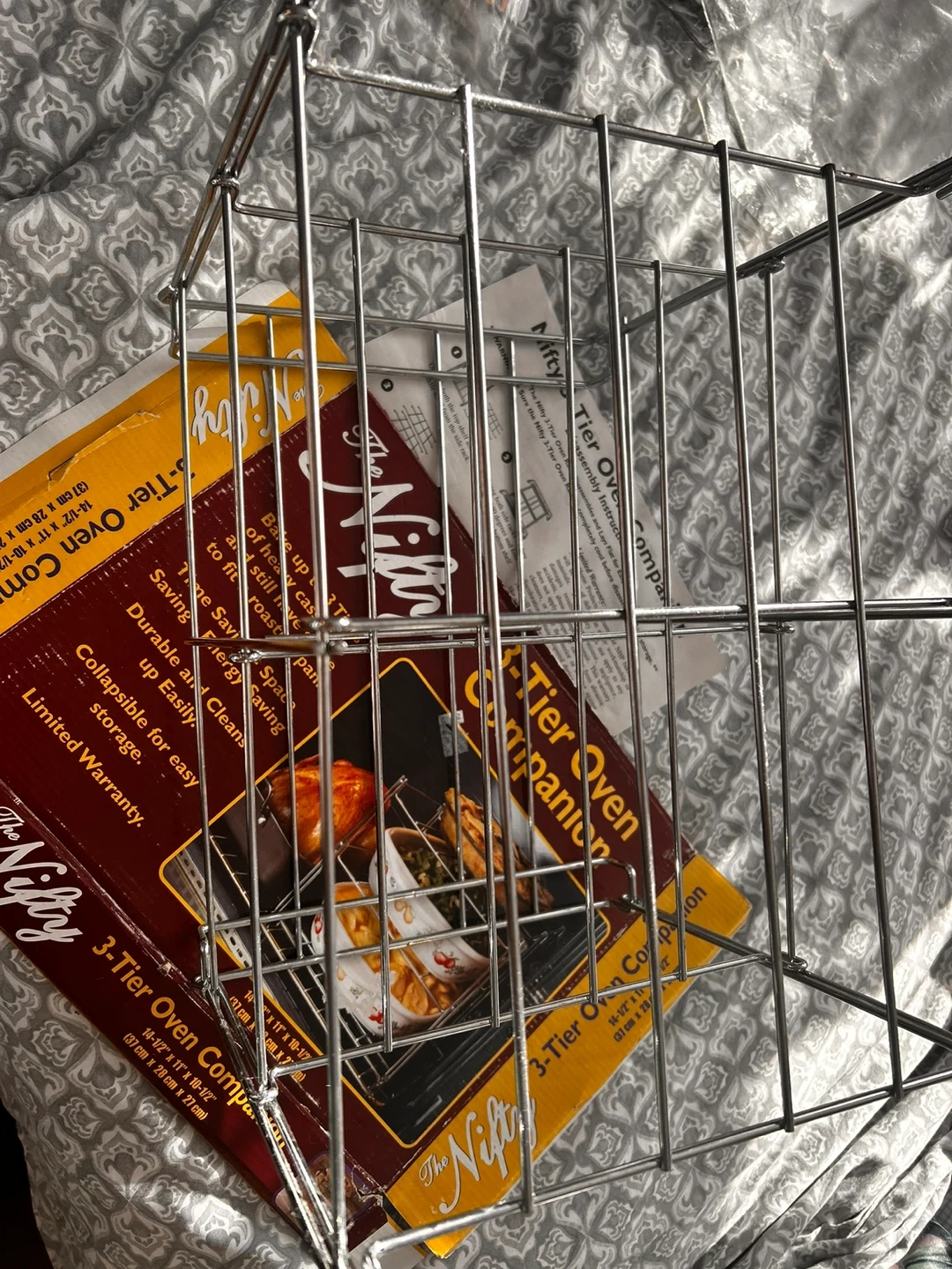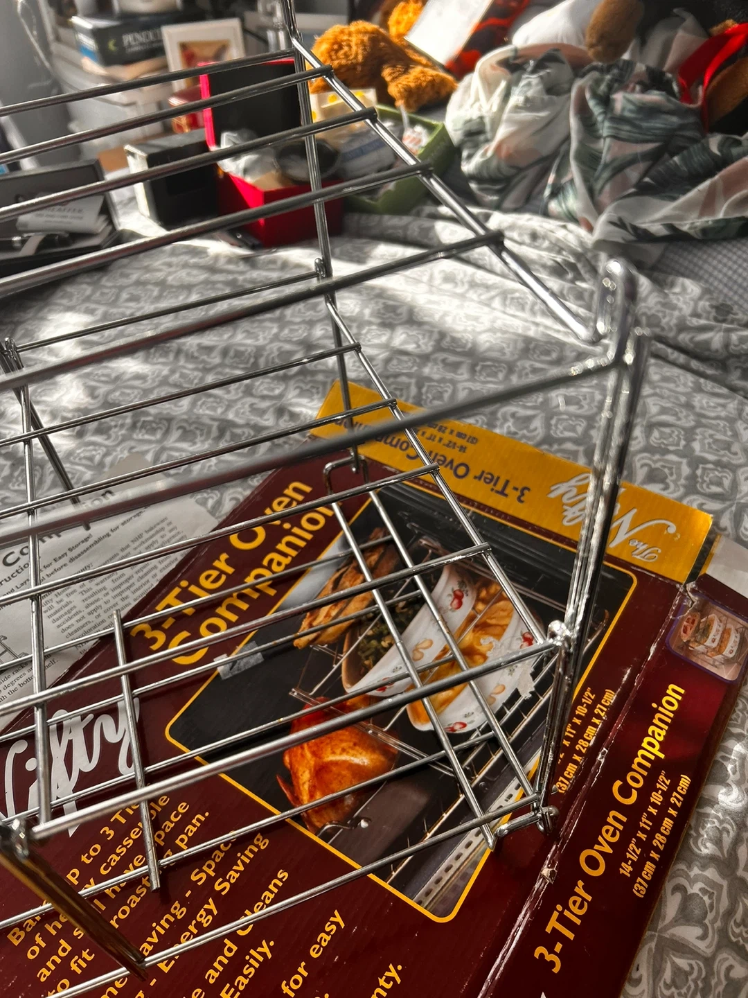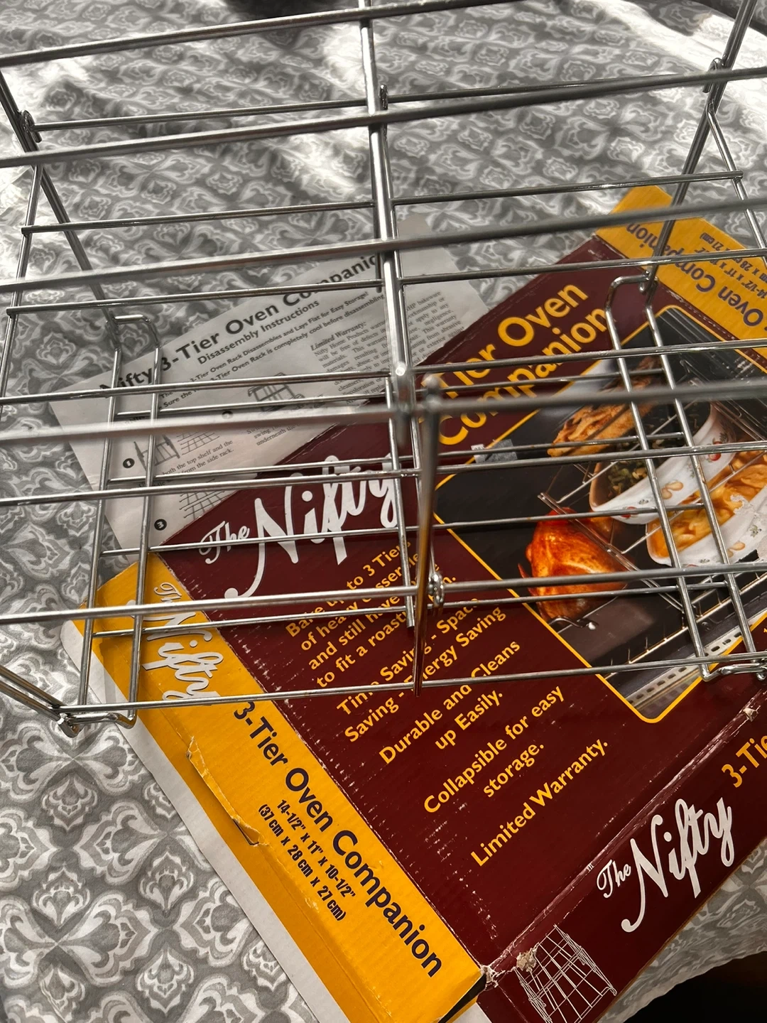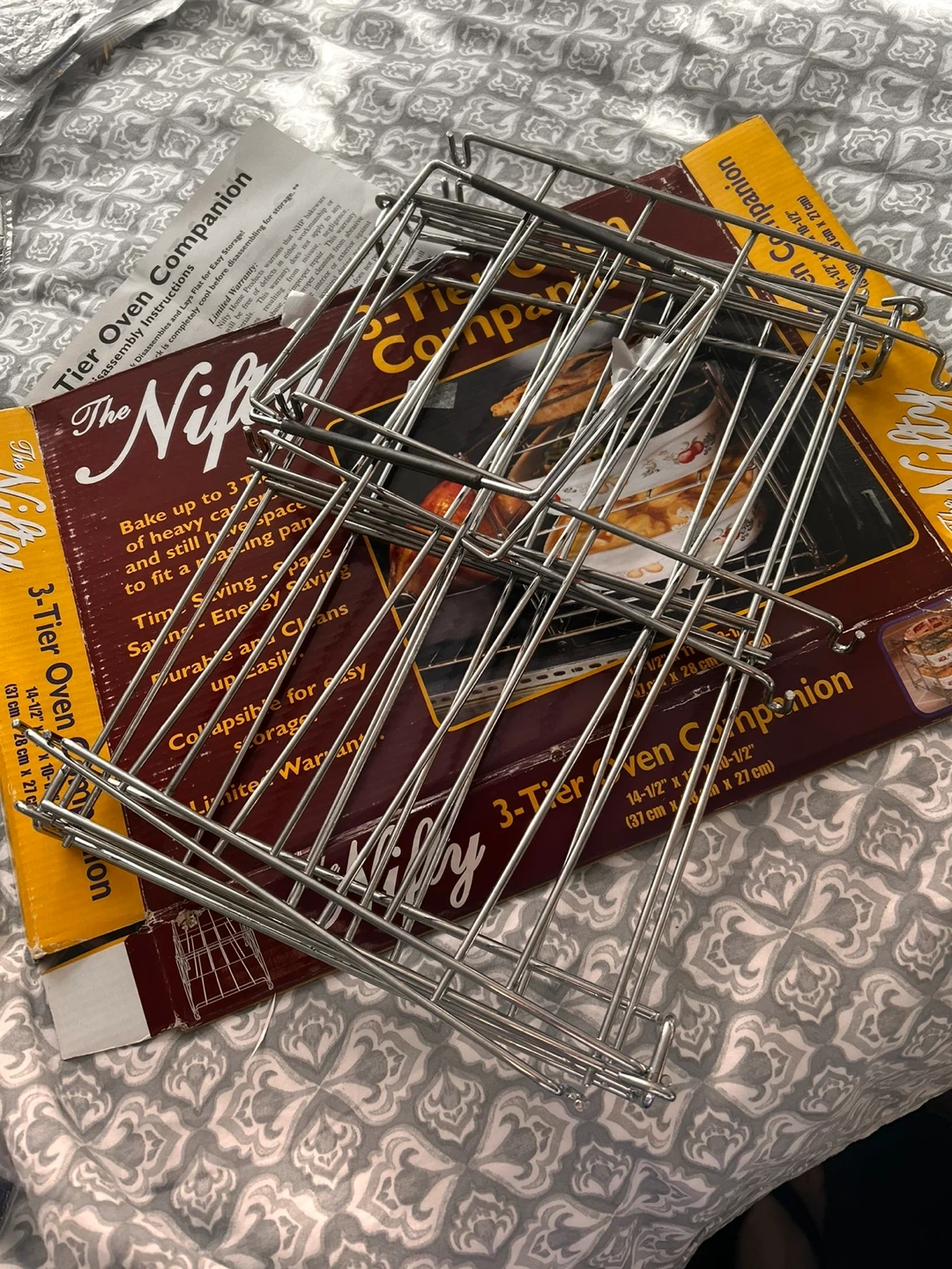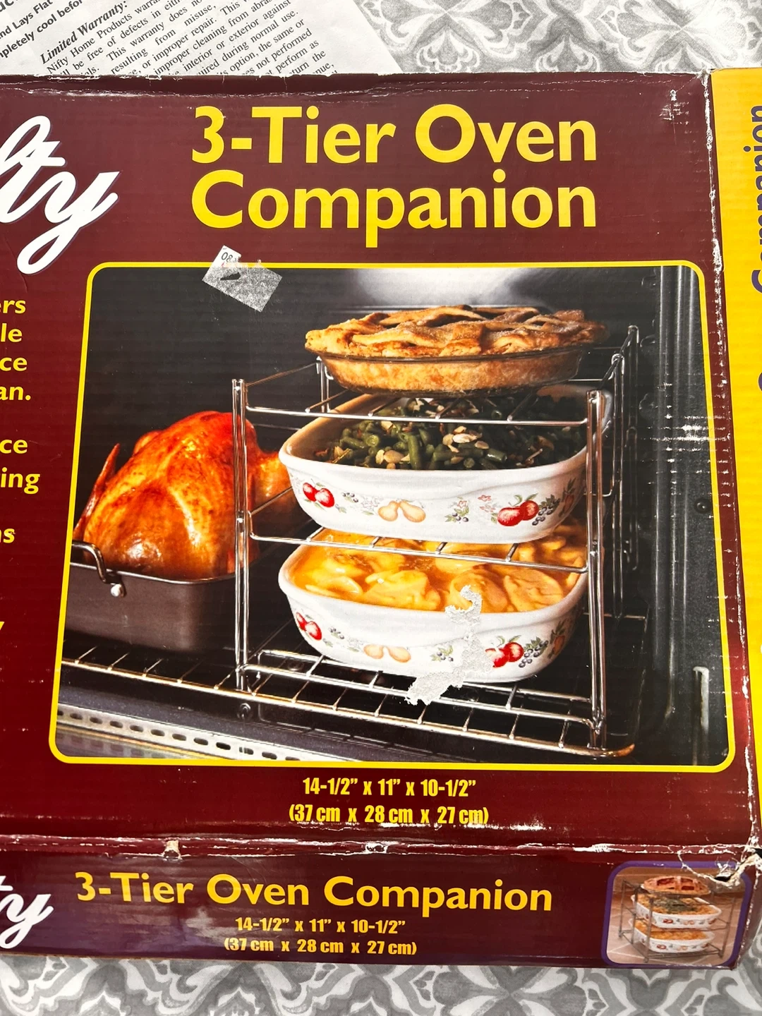 Selling a The Nifty 3-Tier Oven Companion. It's great for saving space in the oven and cooking multiple dishes at once. The dimensions are 14-1/2" x 11" x 10-1/2" (37 cm x 28 cm x 27 cm).