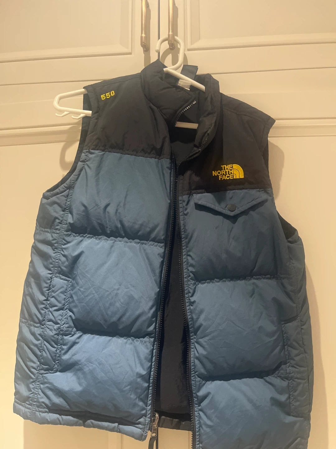 10Selling a The North Face 550 puffer vest. It's a stylish and warm vest, perfect for layering during cooler weather. It features a blue and black colour block design with the iconic North Face logo on the chest.