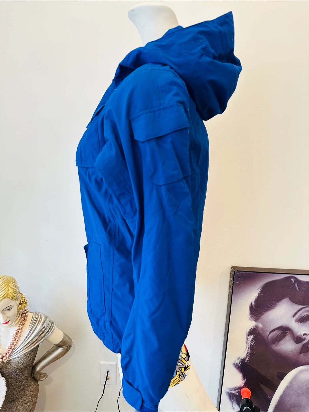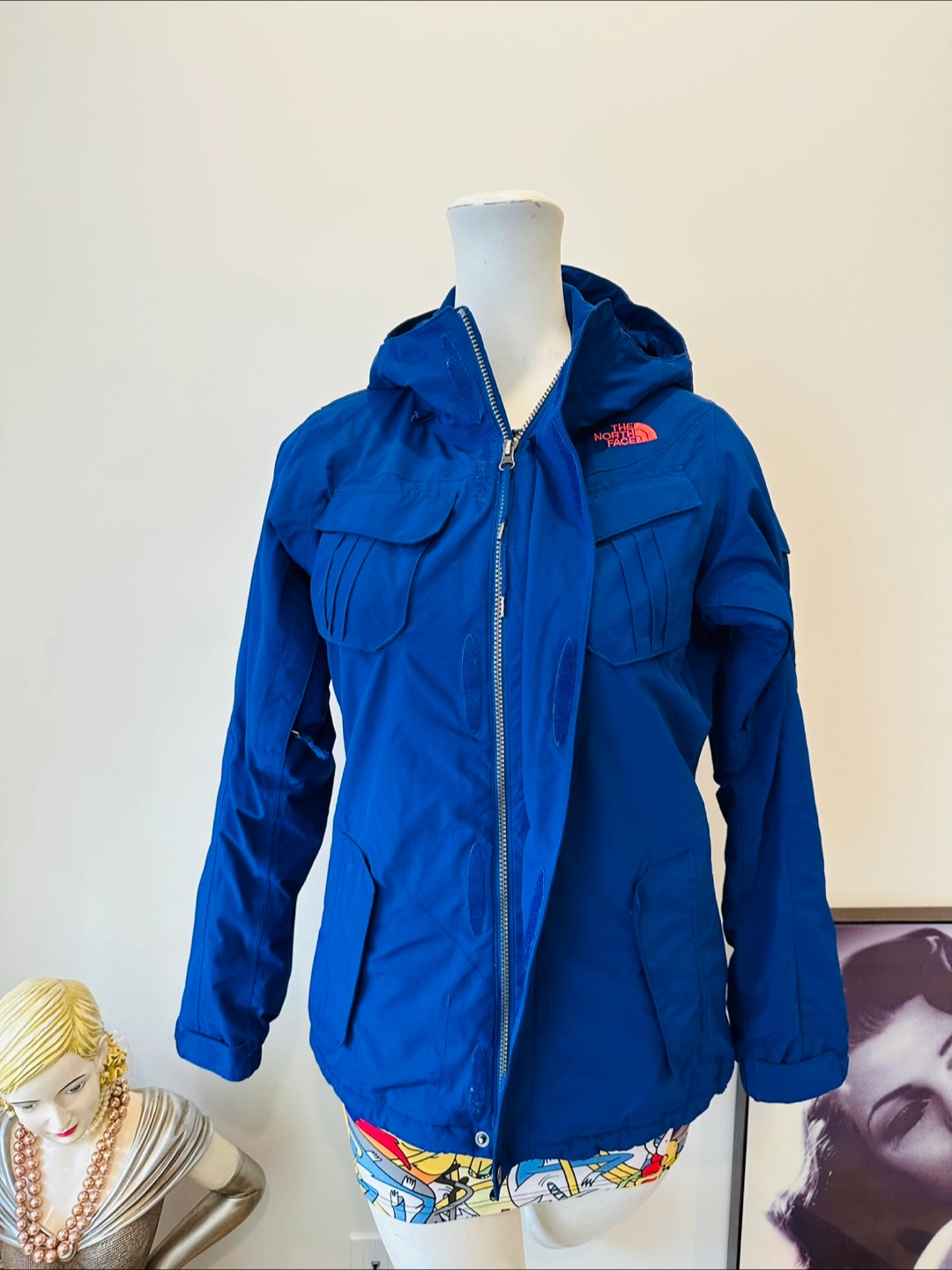 Check out this stylish blue hooded jacket from The North Face! It's perfect for those cooler days and has a comfortable fit. The jacket features a full zip front, a hood, and multiple pockets for your convenience. It's in great condition and ready for a new home!