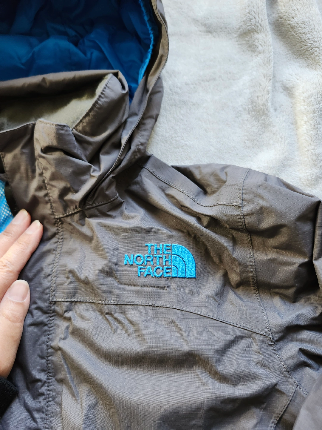 Selling a boy's rain jacket from The North Face in size M (10/12). It's a stylish grey colour with blue accents on the inside of the hood and cuffs. Perfect for keeping dry on rainy days! Non-smoking home. Pick up at Elmbrook Park Library in Etobicoke.