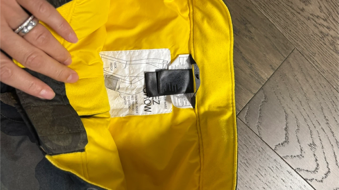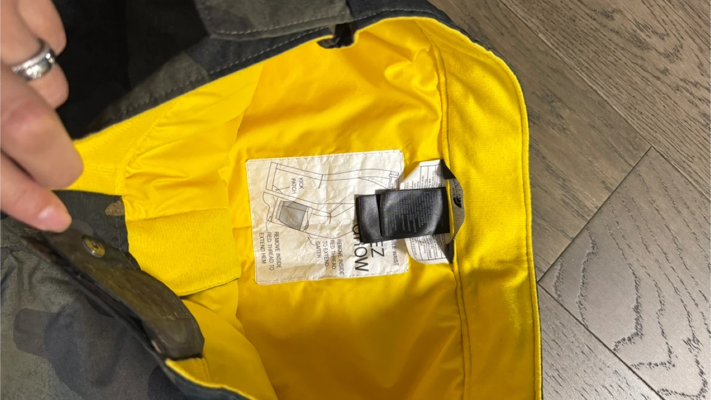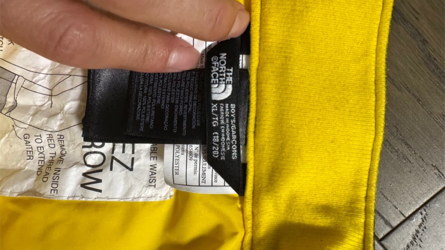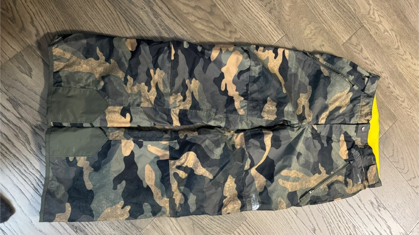 Selling a pair of The North Face snow pants in a boys' size XL (18/20). They feature a cool camouflage pattern on the outside and a bright yellow lining. Ready for some winter fun!