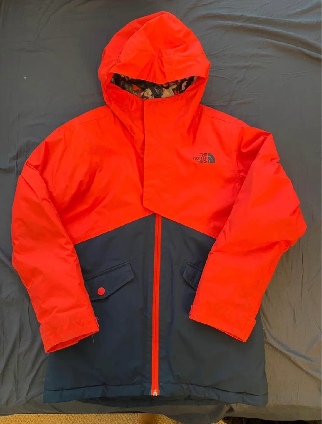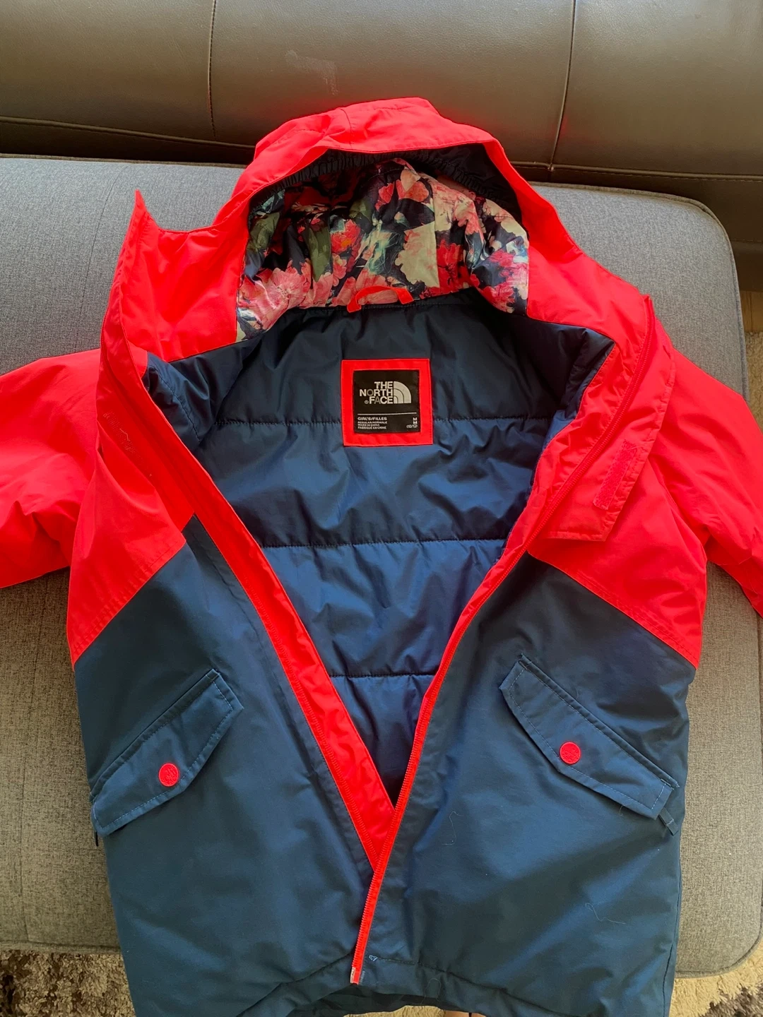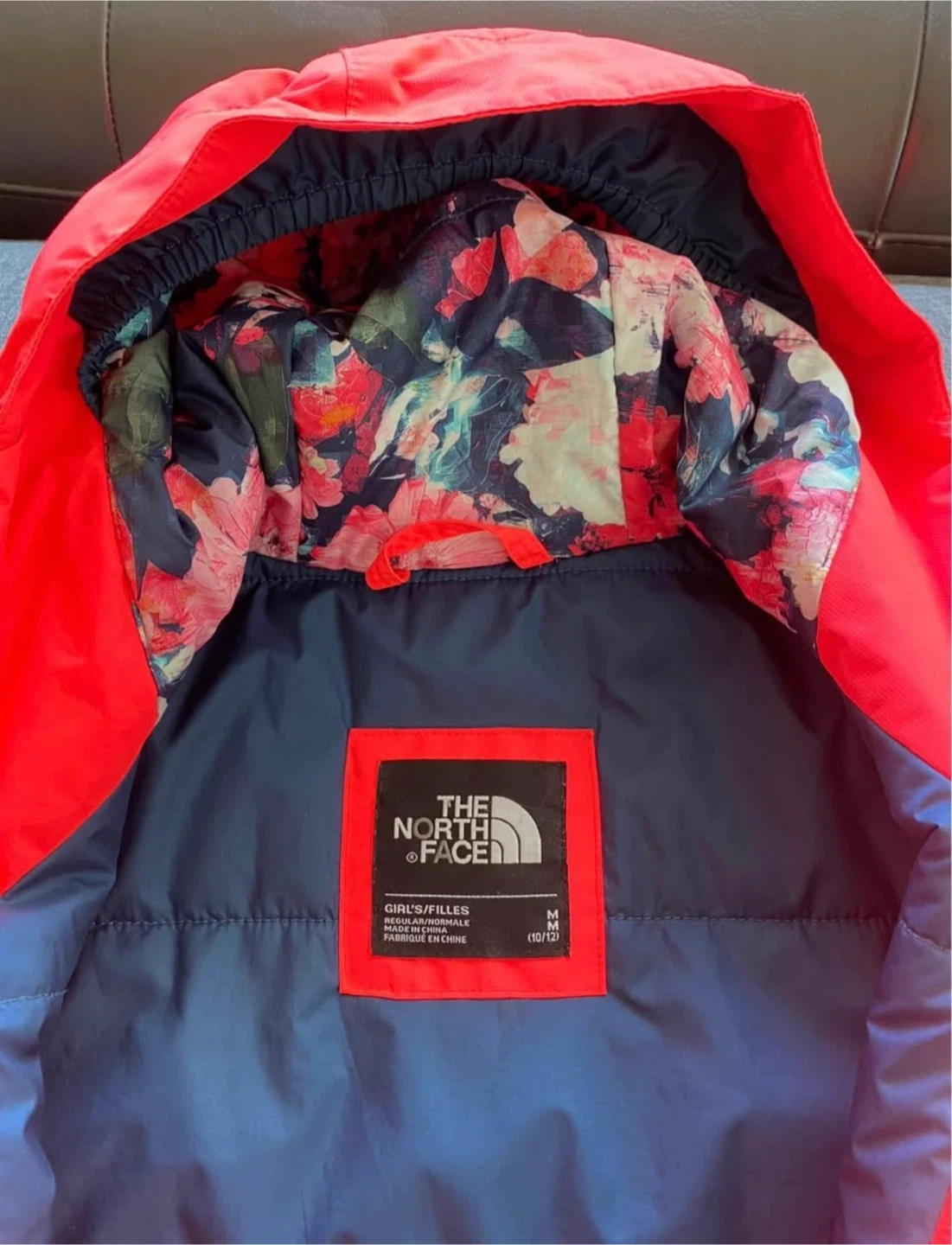 10Selling a girl's The North Face jacket in great condition! It's a size M (10/12) and features a vibrant red and navy colour block design. The jacket also has a lovely floral pattern on the inside of the hood. Perfect for keeping your little one warm and stylish!