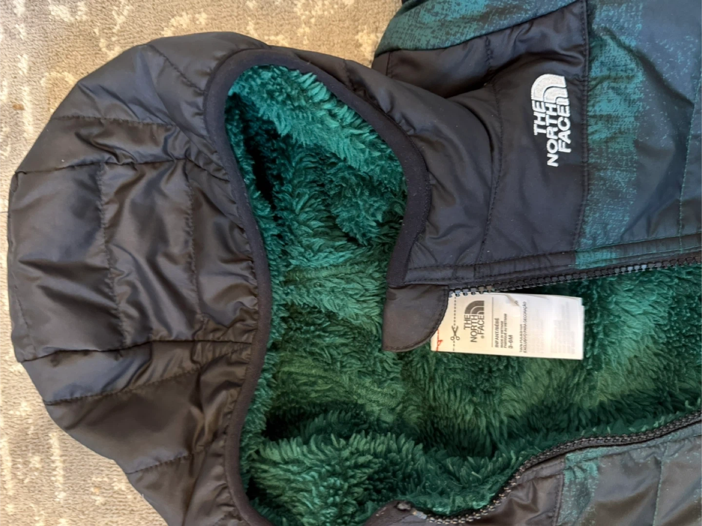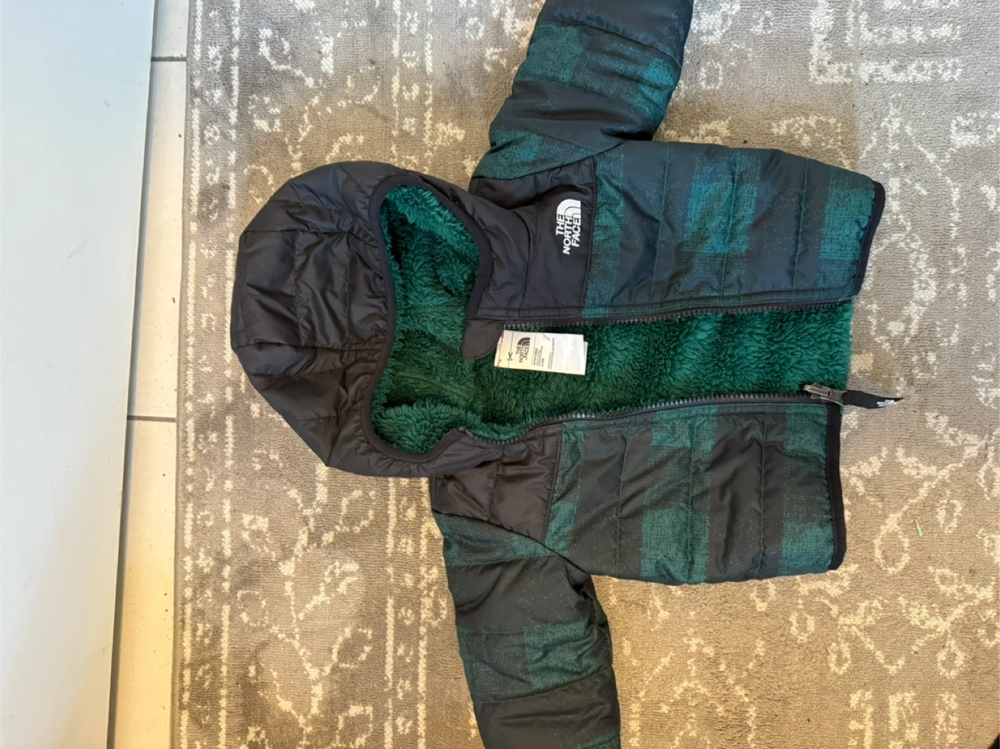 10The North Face infant jacket, size 3-6 months. It's in great shape and ready for a new little one! The jacket features a cozy green fleece lining to keep your baby warm and comfy. It has a black and green plaid pattern on the outside. It’s reversible. Perfect for the cooler weather!