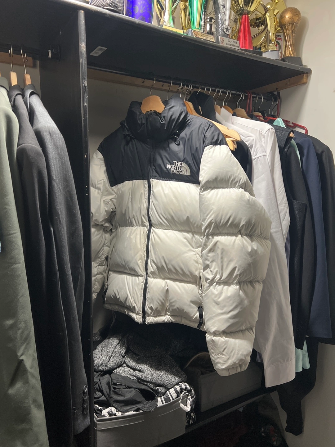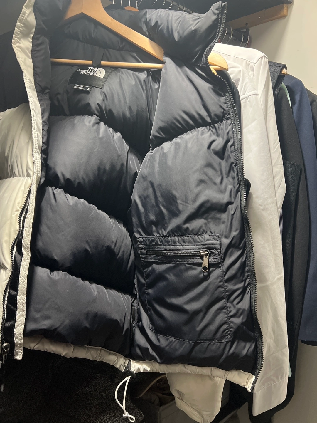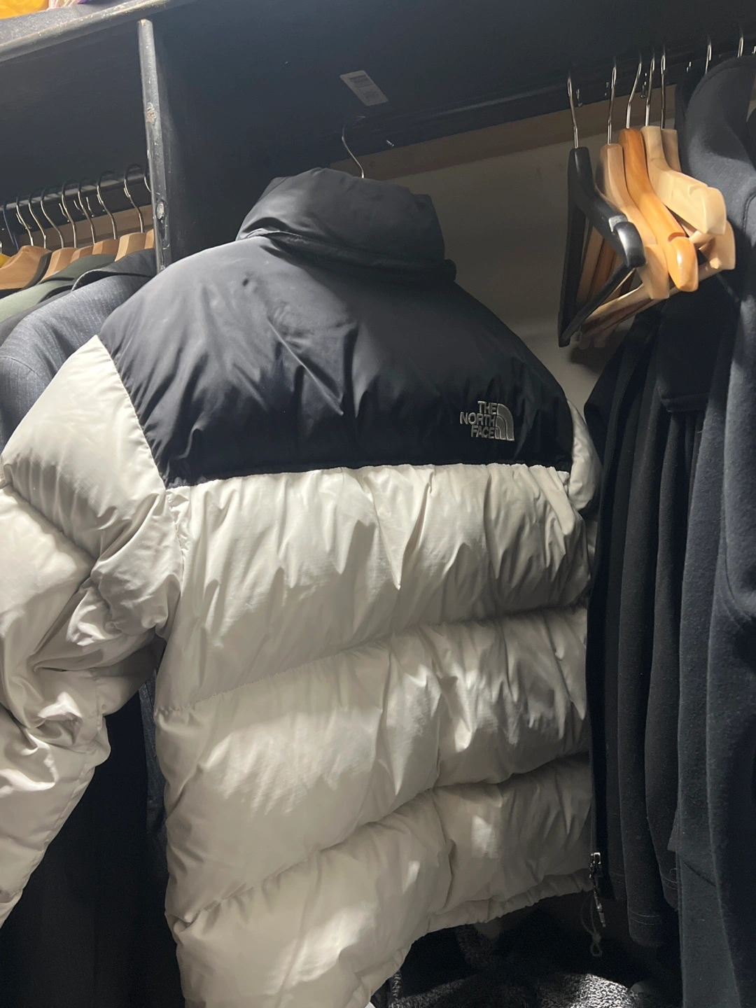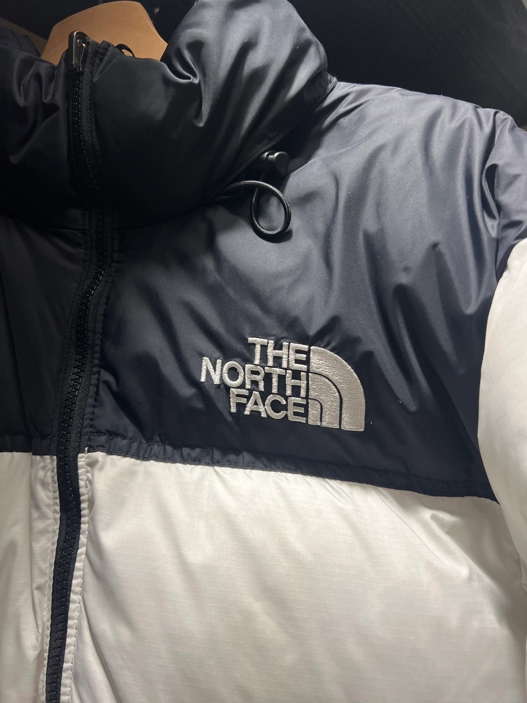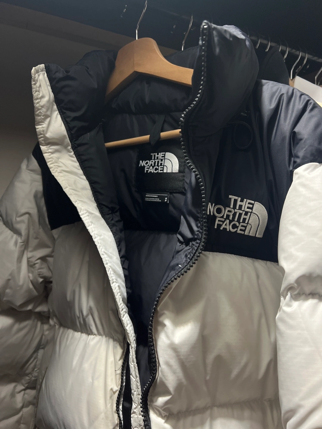 The North Face Nuptse puffer jacket. White and black colourblock design. Features a zip closure and inner pocket. Excellent for cold weather. Js need a wash and looks brand new