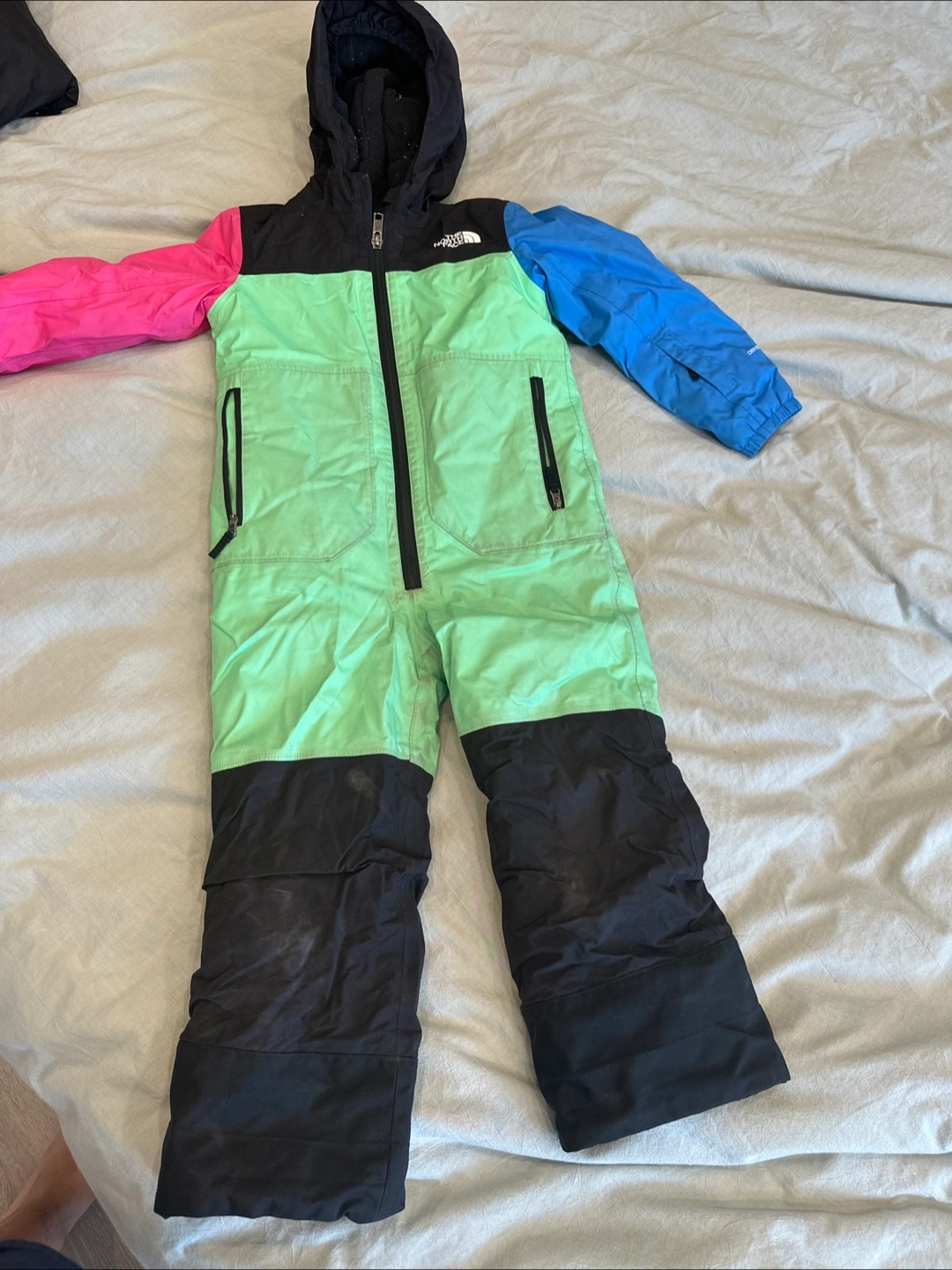 Here's a colourful snowsuit from The North Face for kids! It features a unique design with pink, blue, green, and black sections. It's in good condition for keeping your little one warm and dry during winter activities. Size 4