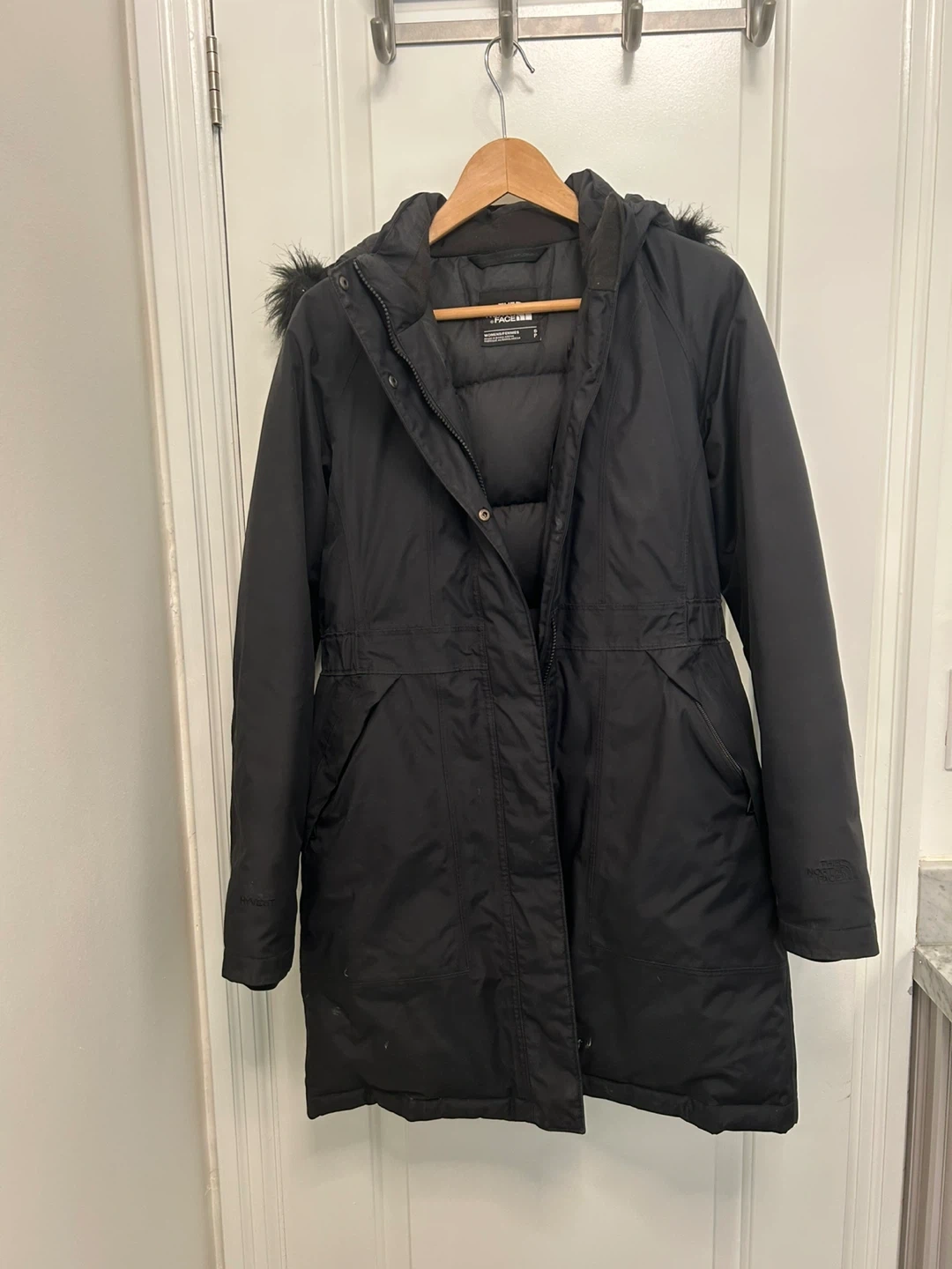 20Selling a black The North Face parka. It's in great condition and perfect for the Canadian winter! It has a faux fur trim on the hood. Size small. Knee length.