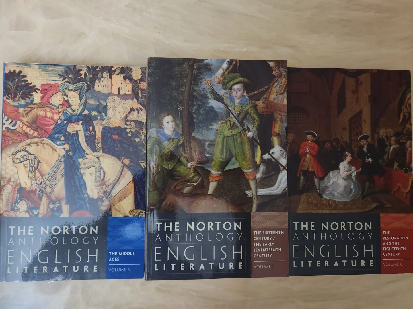 50Selling a complete set of The Norton Anthology English Literature. Includes Volume A (The Middle Ages), Volume B (The Sixteenth Century / The Early Seventeenth Century), and Volume C (The Restoration and the Eighteenth Century). Great resource for students or anyone interested in English literature! The initial plastic wrap has been opened but the books were never used nor opened before!
