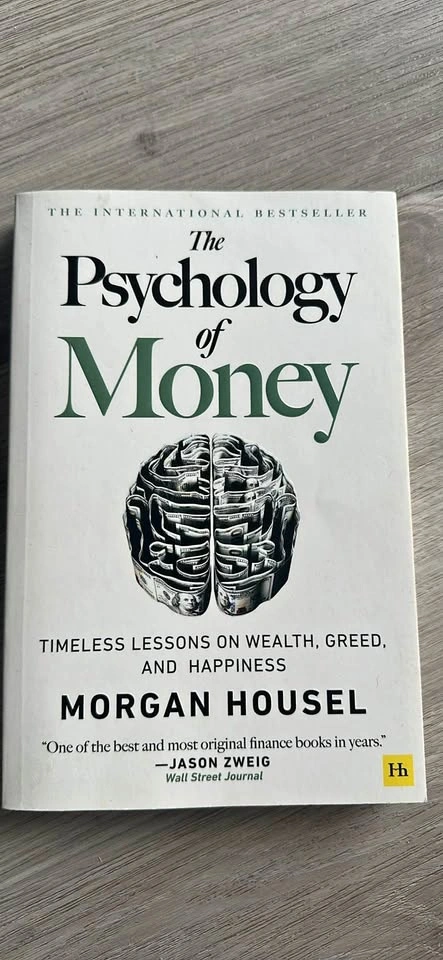 10Great condition! The Psychology of Money by Morgan Housel is an international bestseller. It has a white cover with a brain illustration made up of dollar bills. The subtitle reads 'Timeless lessons on wealth, greed, and happiness'.