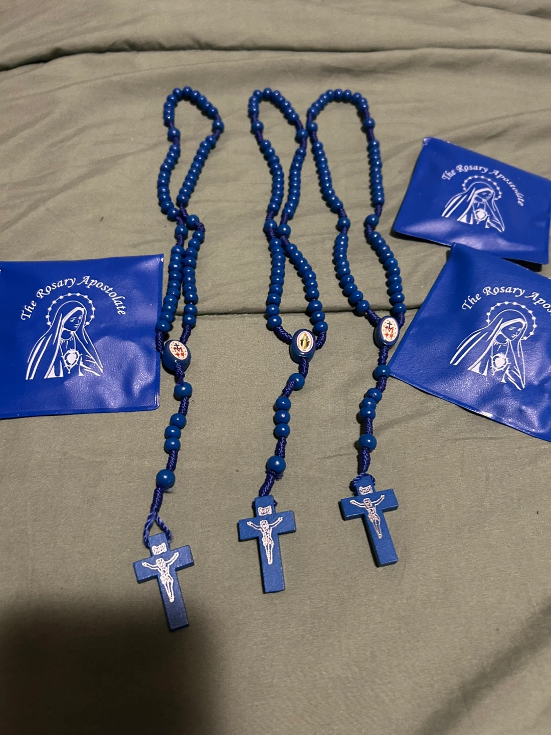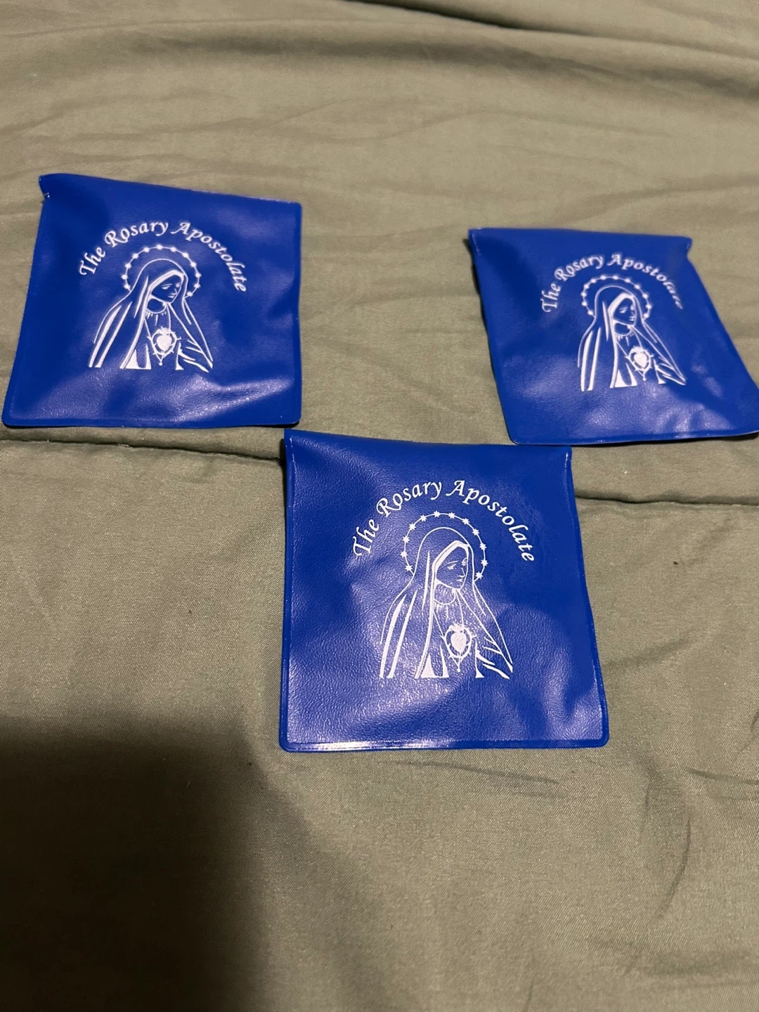 Selling three blue rosaries from The Rosary Apostolate. Each comes with its own little pouch. selling as a bundle.