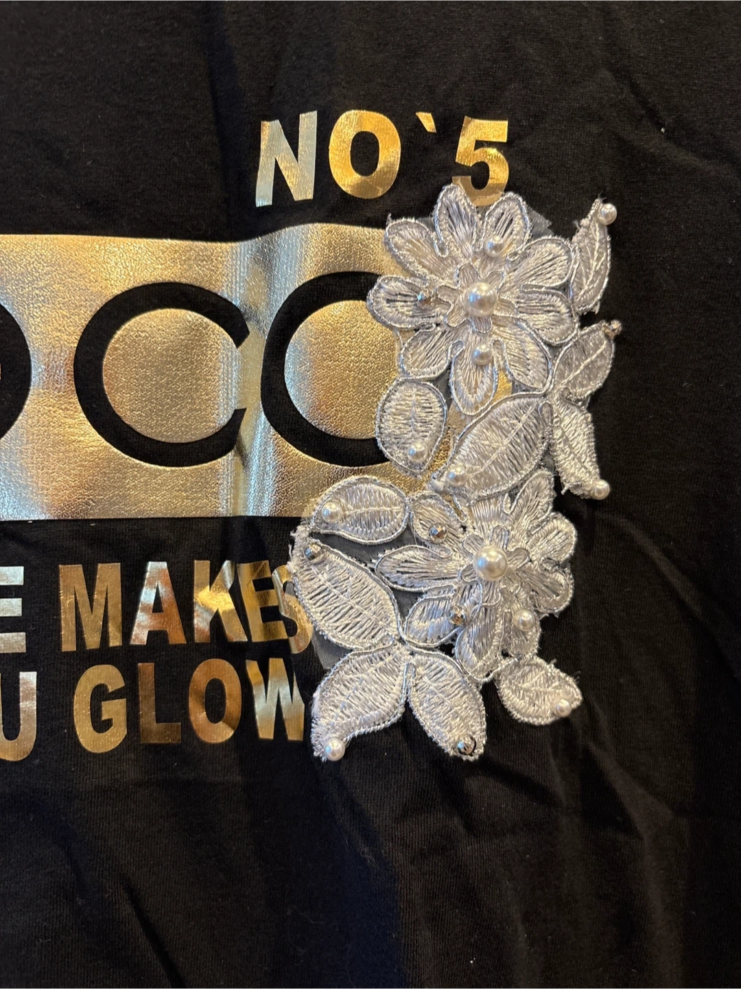 Here's a cute black t-shirt from The Spoon Pudding Candy! It features a Coco design with floral embellishments. Made in Korea.