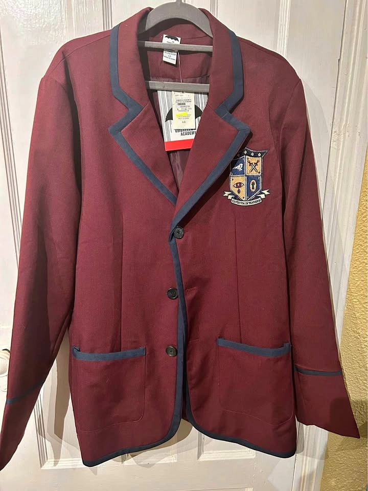 The Umbrella Academy Sparrow Academy Uniform Blazer #large BNWT POV: You save the past from a near-catastrophic nuclear war and come back to a different timeline. Fly with the Sparrows with this blazer inspired by the new season of The Umbrella Academy, featuring embroidery at the chest, contrast tipping and back vent. Shell: 79% polyester; 17% rayon; 4% spandex Lining: 100% polyester $30
