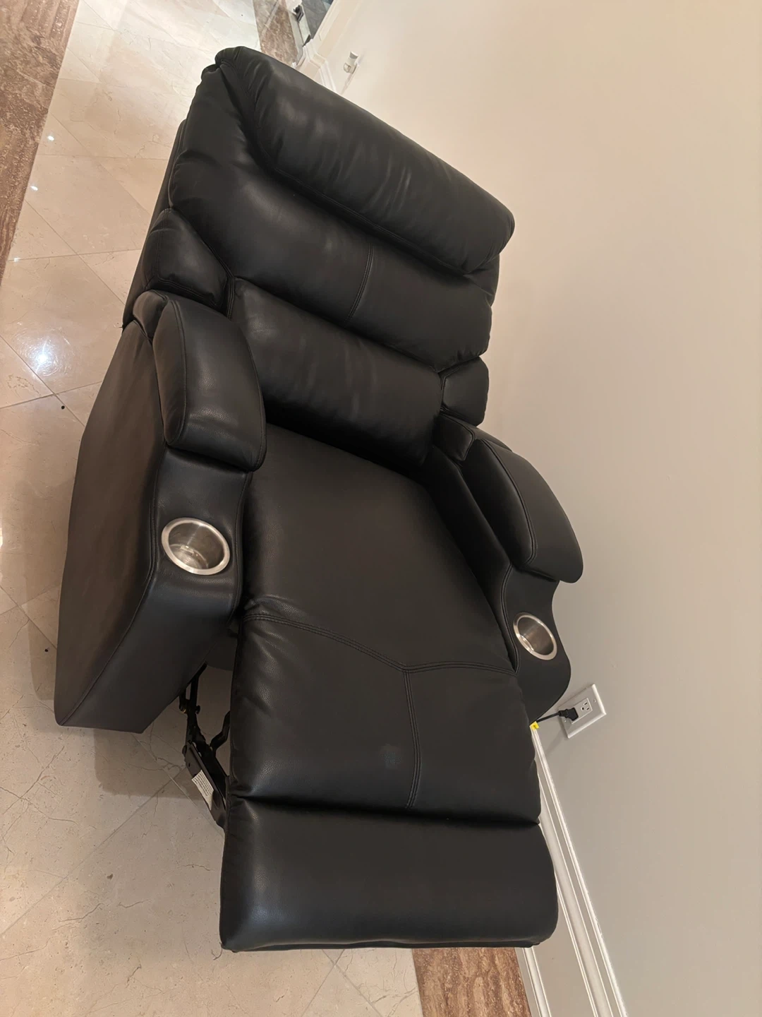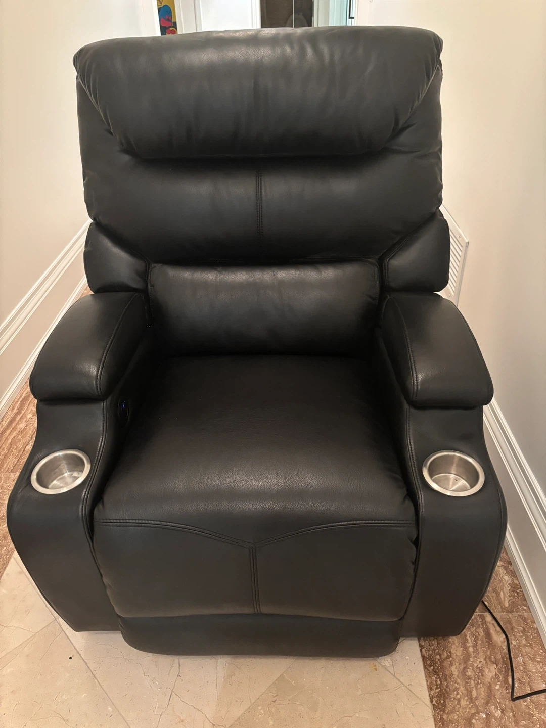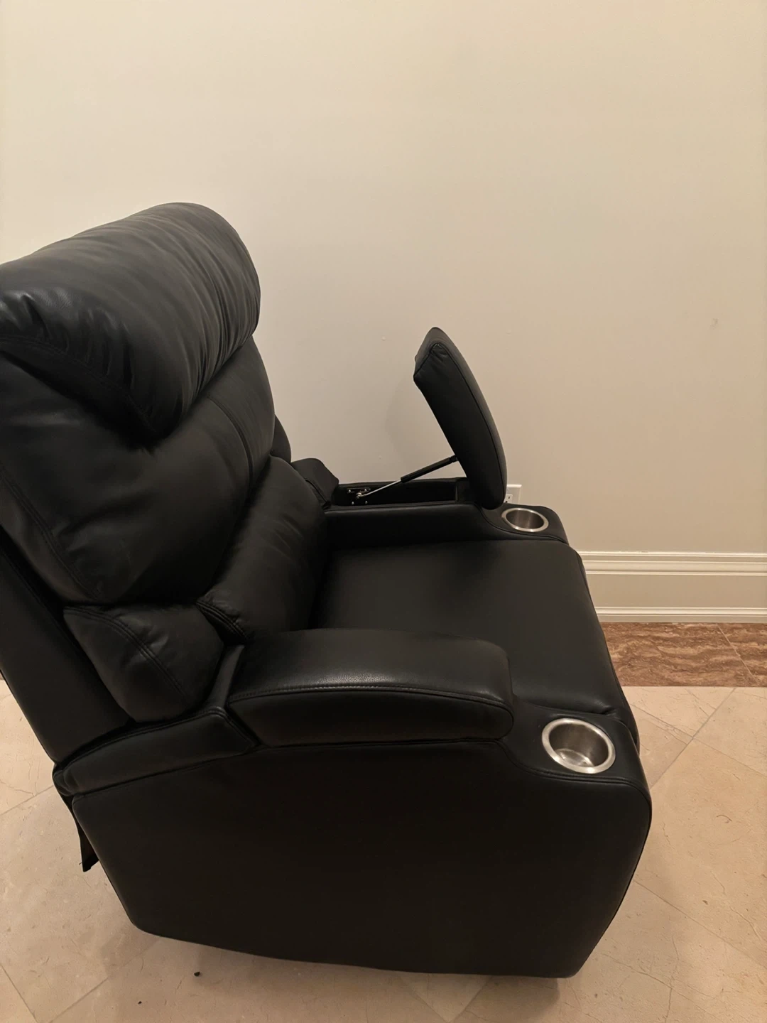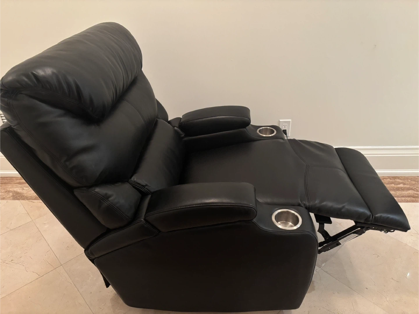 Six electric powered home theater chairs. Each chair offers the ultimate relaxation experience with smooth powered reclining, allowing you to find the perfect viewing angle. Made of soft, black, leather pu upholstery. Easy to clean and durable enough for everyday use. Hidden arm storage. Double stainless cup holders. Versatile design for home theater, living room, or den. Price is per chair.
