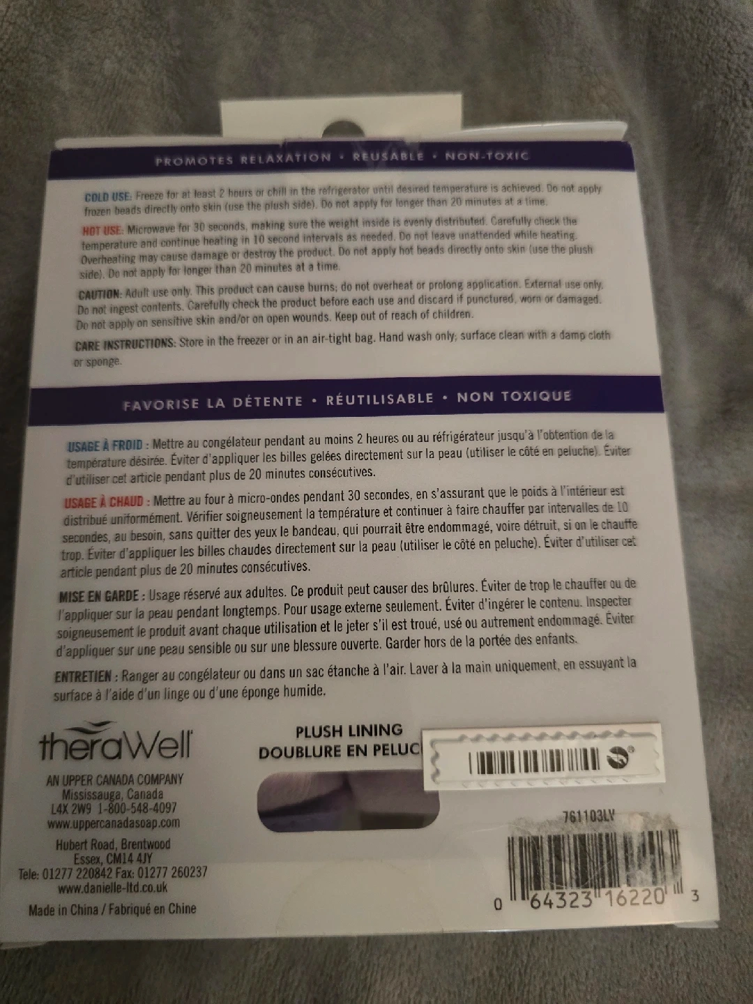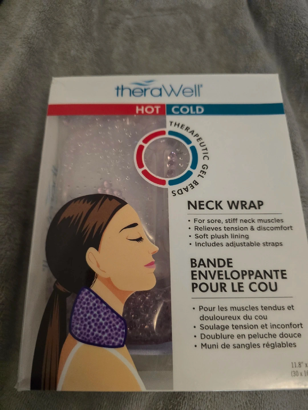 72I'm selling a brand new TheraWell Hot Cold Neck Wrap! It's great for sore, stiff neck muscles and helps relieve tension and discomfort. It has a soft plush lining and adjustable straps for a comfy fit. It can be used hot or cold to suit your needs. The box is included!