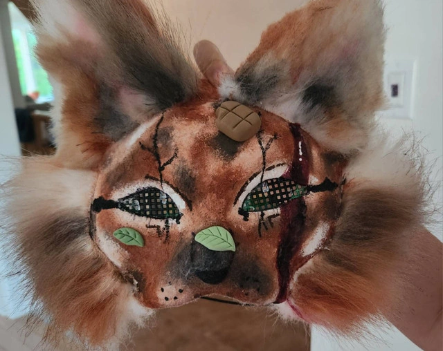 Red spotted cat. Base: Waterproof mask Colouring & details: Paint and markers Texture & structure: Professional, strong faux fur and felt Accessories: Air-dry clay Fur colouring: Paint and water. The water is recommended when softening the paint, such as with watercolour. It creates a soft, smooth texture similar to fur. Brand new Price: $65