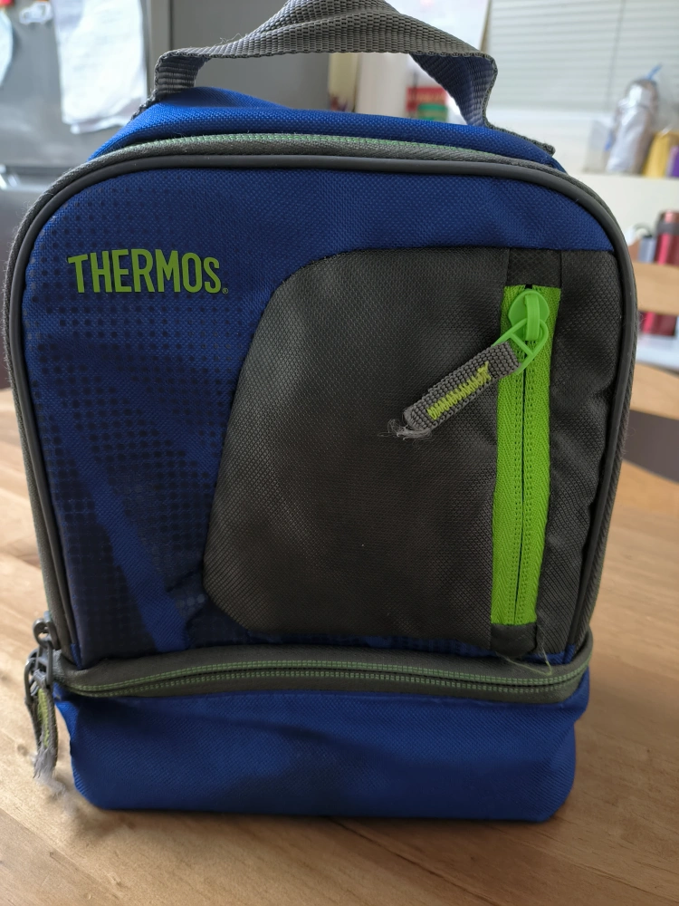 10Keep your lunch cool and organized with this Thermos lunch bag! It features a blue and grey design with a bright green zipper accent. Perfect for school, work, or picnics