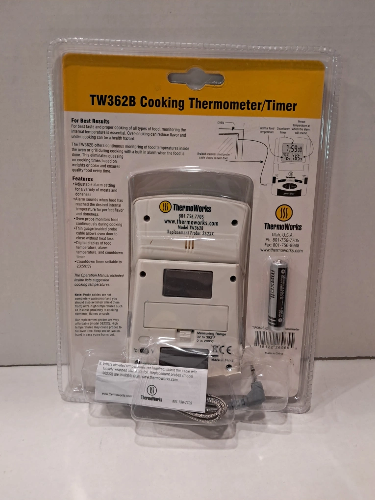 New ThermoWorks TW362B cooking thermometer and timer. Features adjustable temperature alarm, countdown timer, and continuous temperature monitoring.