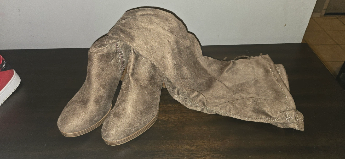 Selling a pair of thigh-high boots in a neutral, versatile colour. They're a size 10 and have a comfortable heel height. Perfect for dressing up any outfit!
