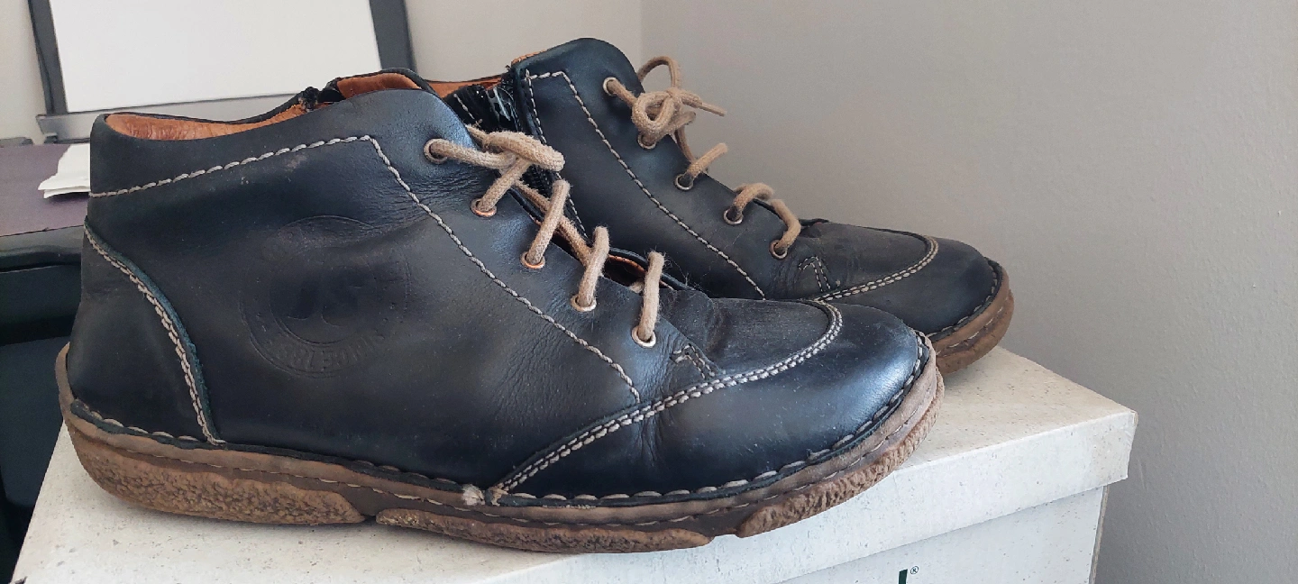 Selling a pair of Think! black leather ankle boots. They are in used condition. Please see photos for details! Joseph Seibel Brand, size 8 Women.