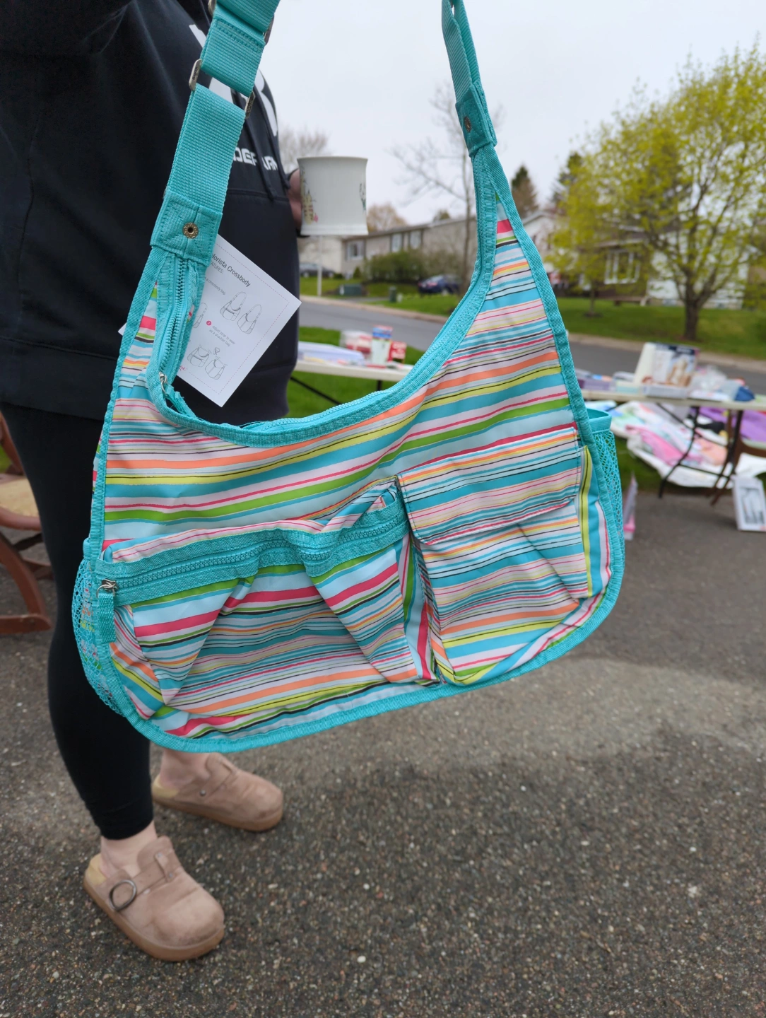 Multicoloured striped fabric. Multiple pockets. Great for everyday use.