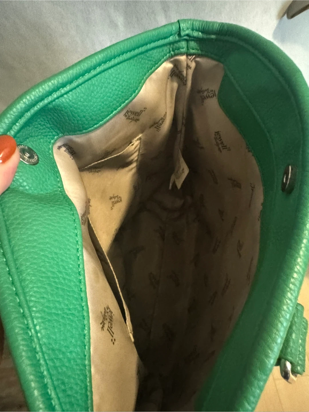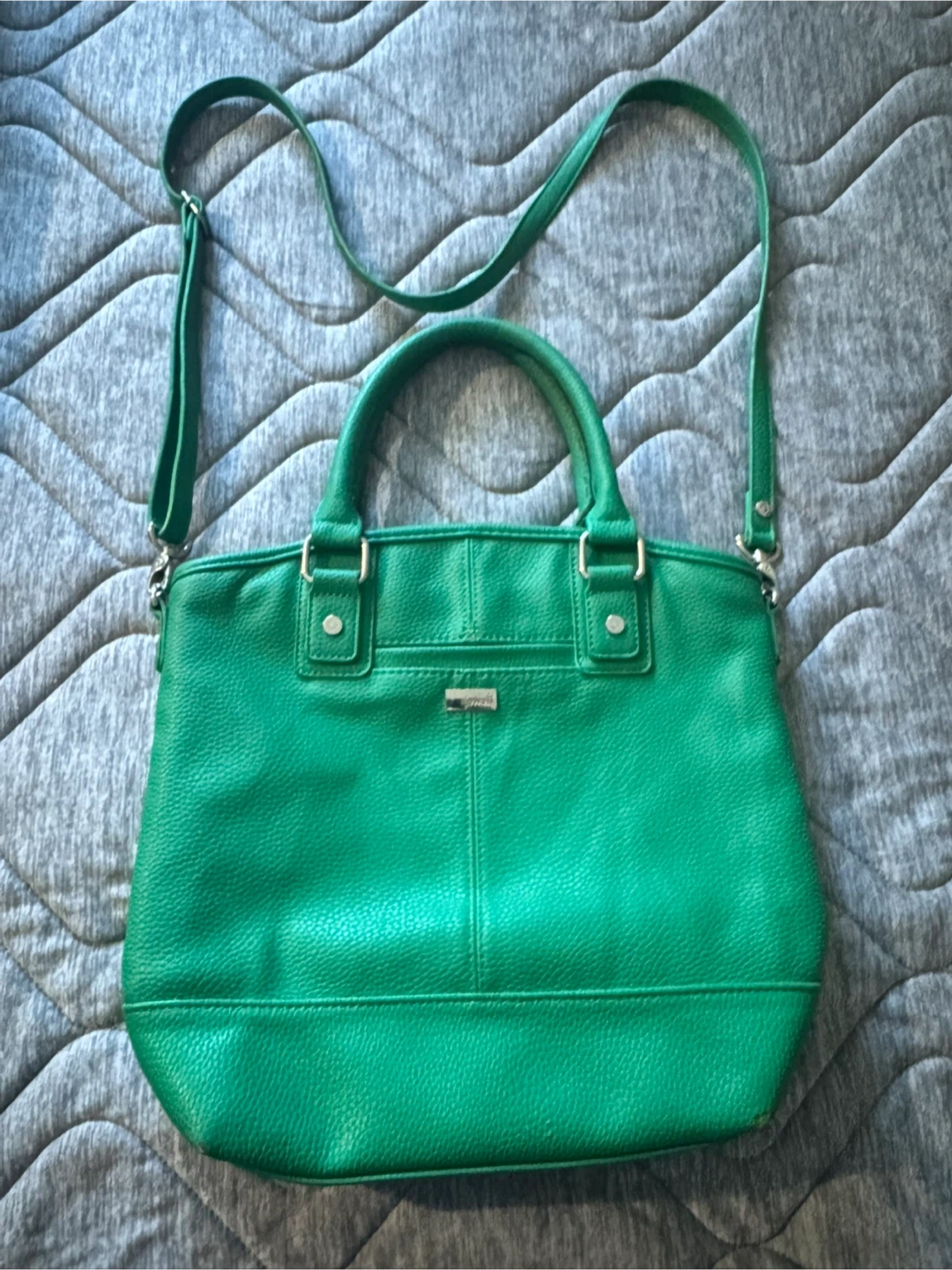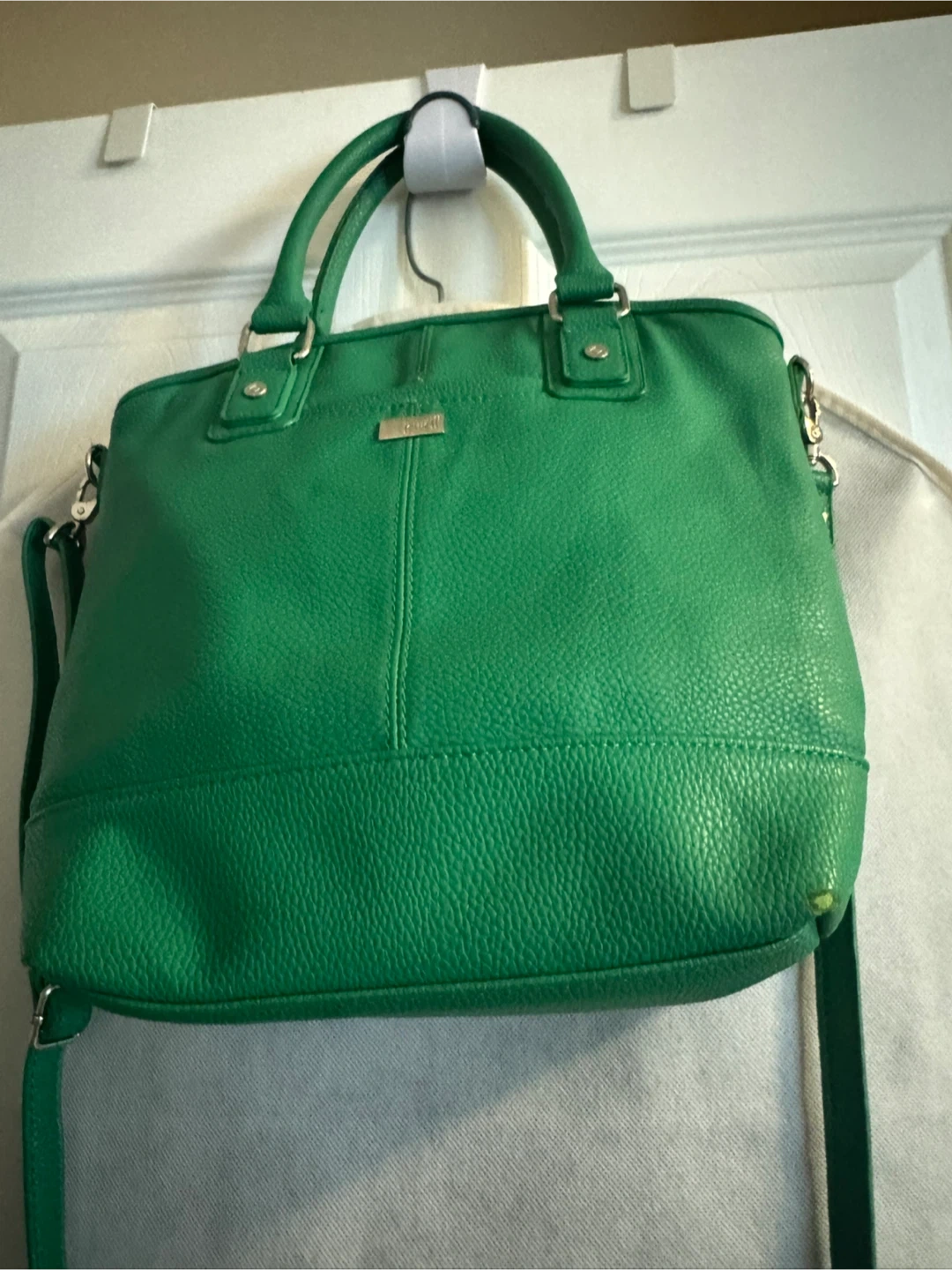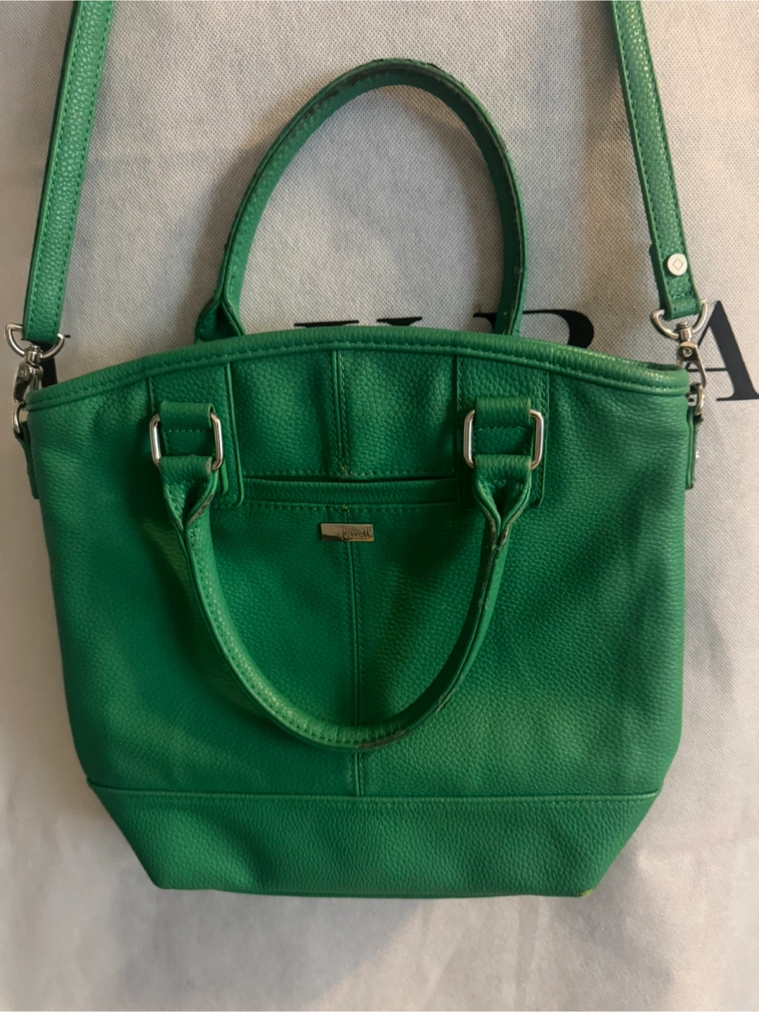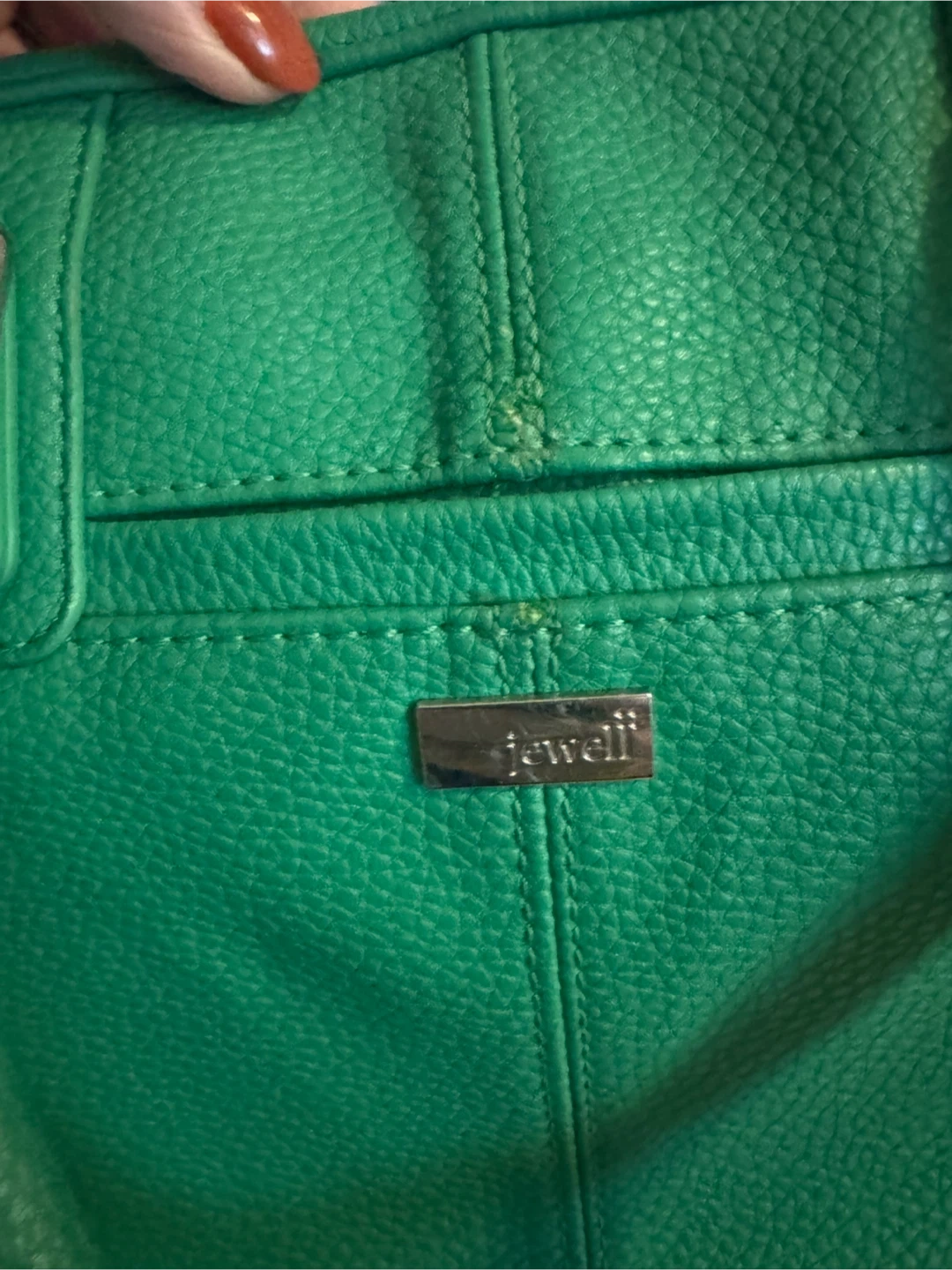 10Selling a Thirty-One Jewell crossbody purse in Kelly green colour! It's made of leather and has both handles and a shoulder strap. There are some signs of wear, but it's still in good condition for everyday use