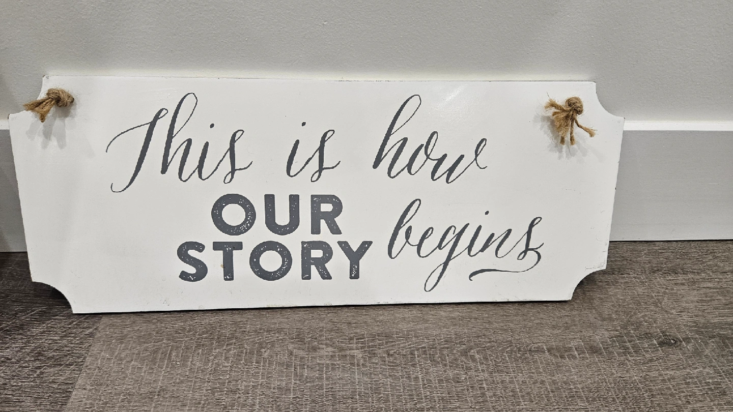 A cute sign that reads, "This is how our story begins". It's perfect for a wedding, nursery, or just a sweet sentiment for your home