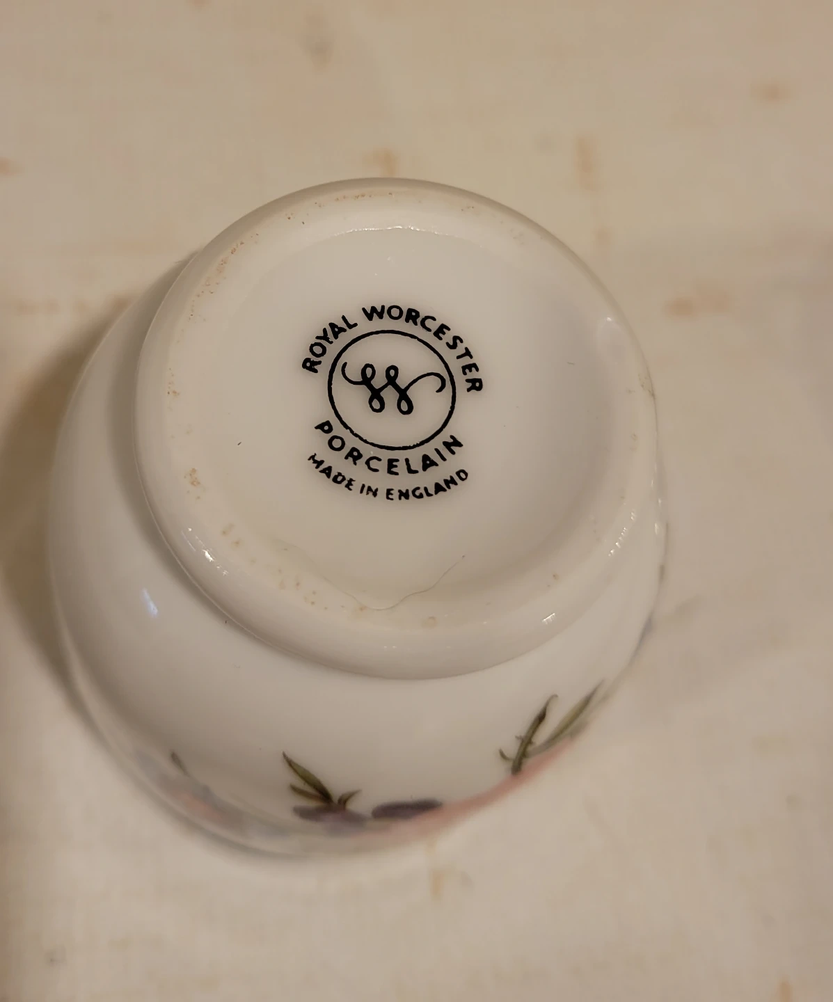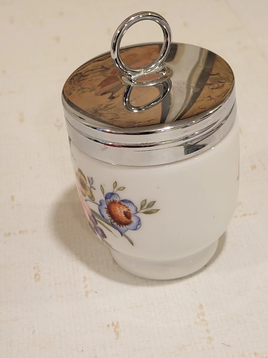 This charming vintage Royal Worcester porcelain egg coddler, made in England, features a delightful floral design and a convenient chrome top with a loop. It's a lovely piece for adding a touch of elegance to your breakfast routine! The Royal Worcester egg coddler is known for being high-quality pieces.