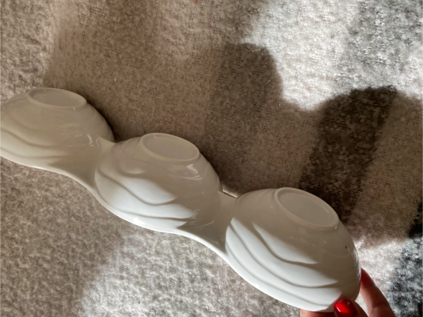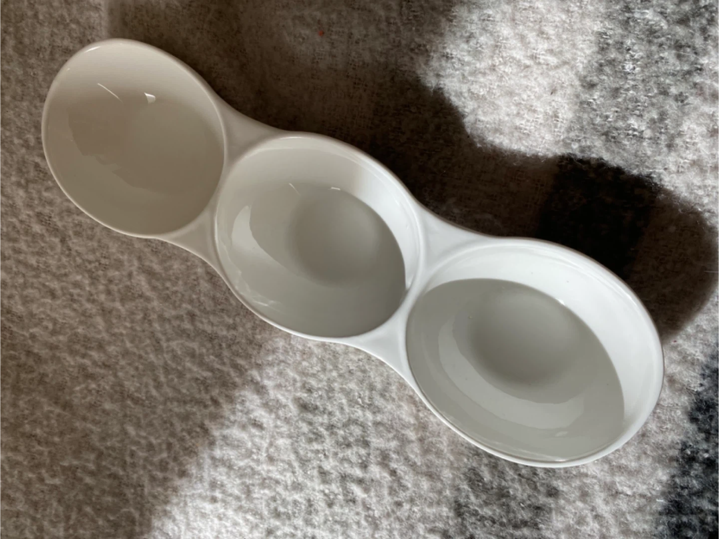 White ceramic serving dish with three connected sections. Measures approximately 12 inches long. Dishwasher safe.