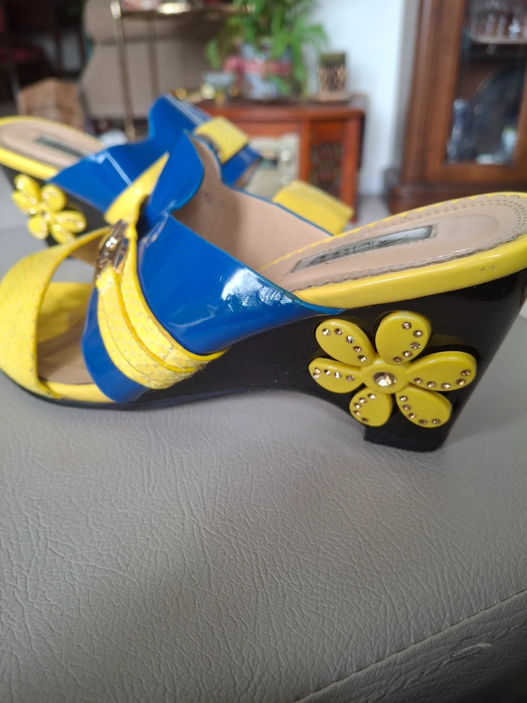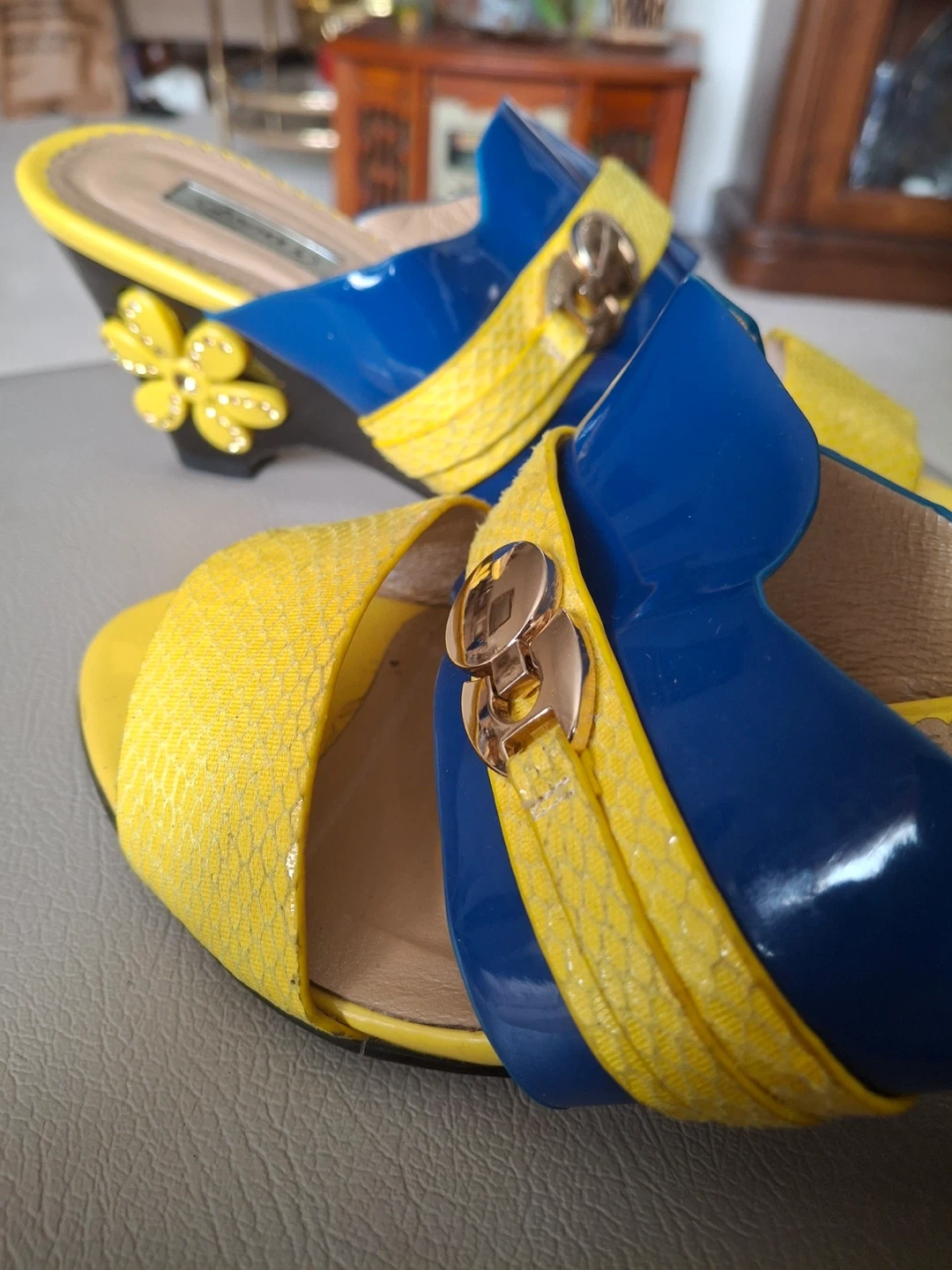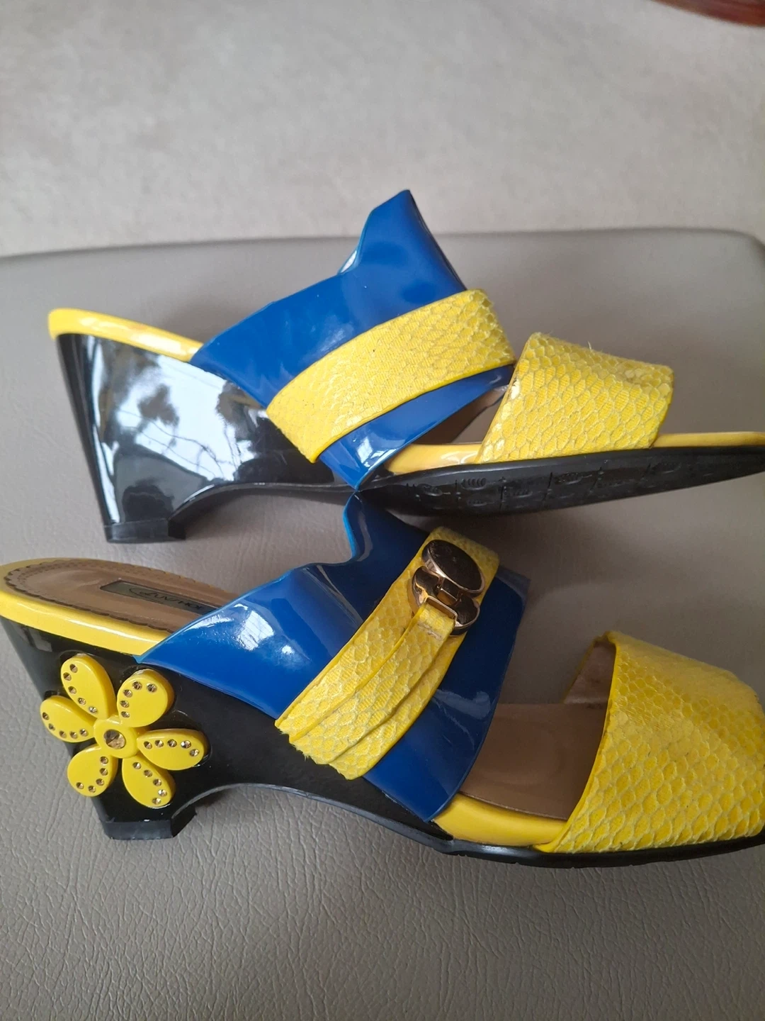 Blue and yellow wedge sandals with flower detail