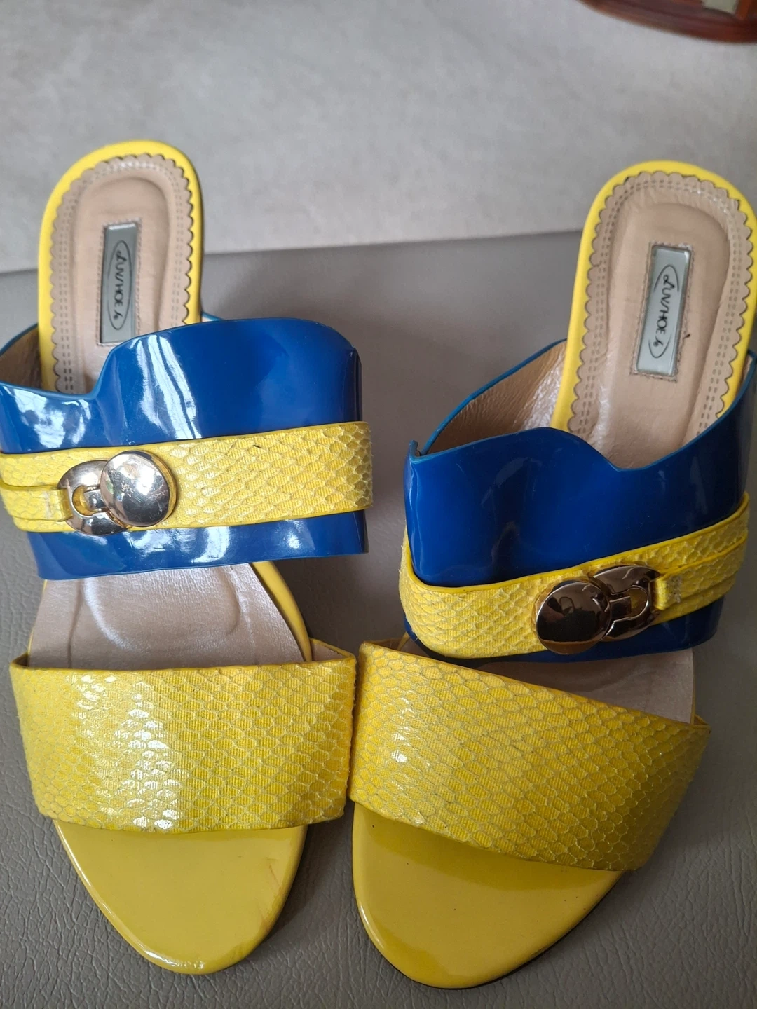 Yellow and dark blue shoes with brass-like detail and a fun flower detail on the heel. 3” heel. Size 8, Eur 38. Luvshoes brand. Worn only twice (slight scuff at bottom of one heel)