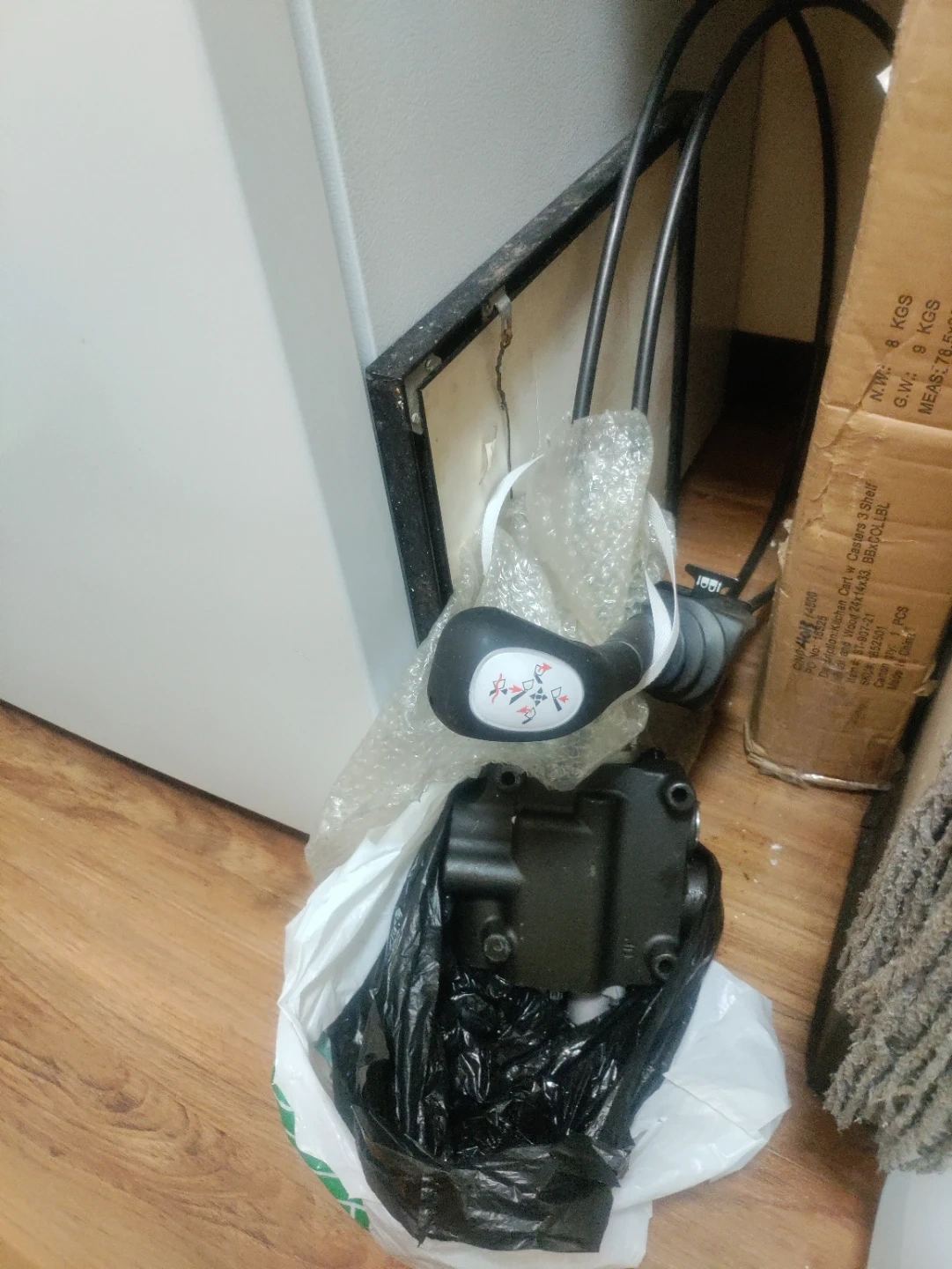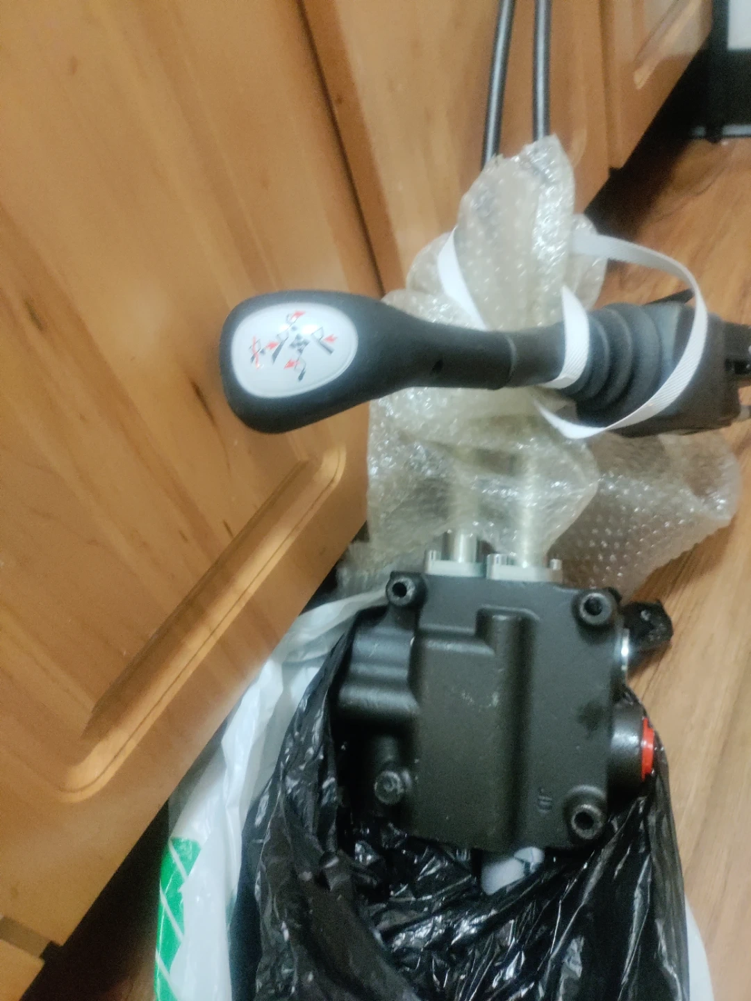 This is a hydraulic control valve with a lever assembly. It's designed for industrial use. The unit appears to be made of durable metal components.