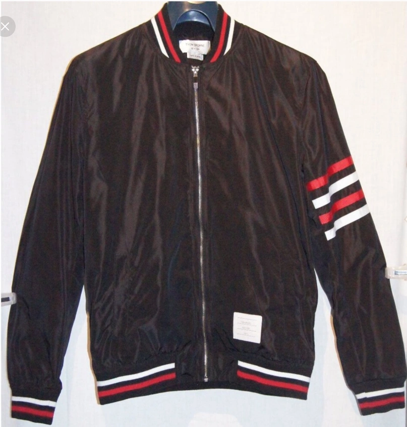 Thom Browne Nylon bomber jacket Black w/ Red & White stripes Hardly Used Size 3 (XXL) Fits more like an M or L 22.5 inches W X 27 inches L Sleeve 31 inches