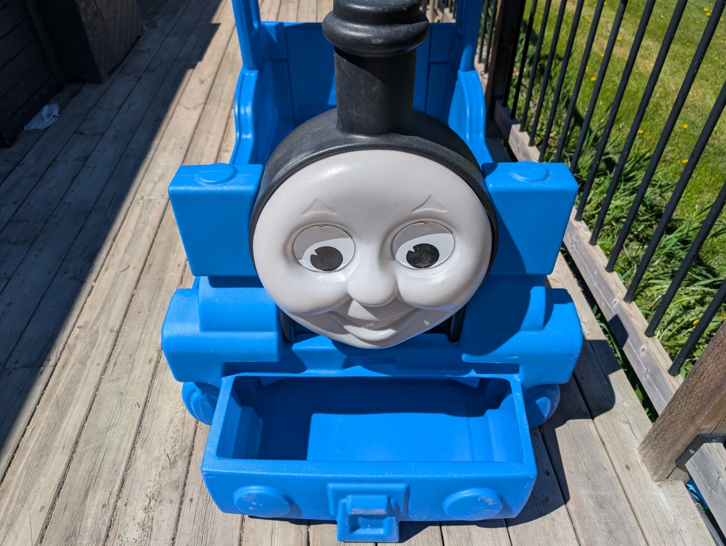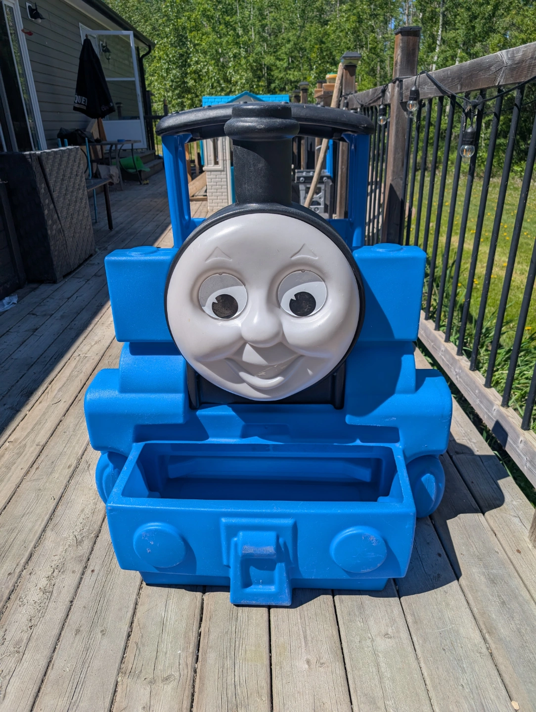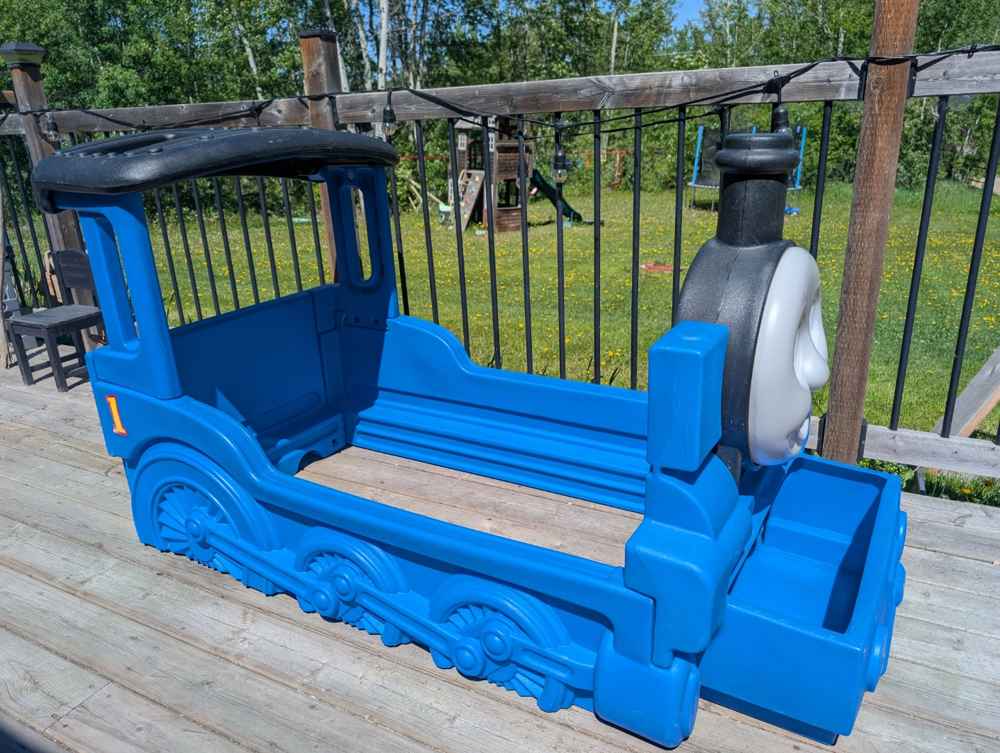 10Blue plastic toddler bed. Shaped like Thomas the Tank Engine. Number 1 on the side. fits crib mattress. had a toy area in the front.